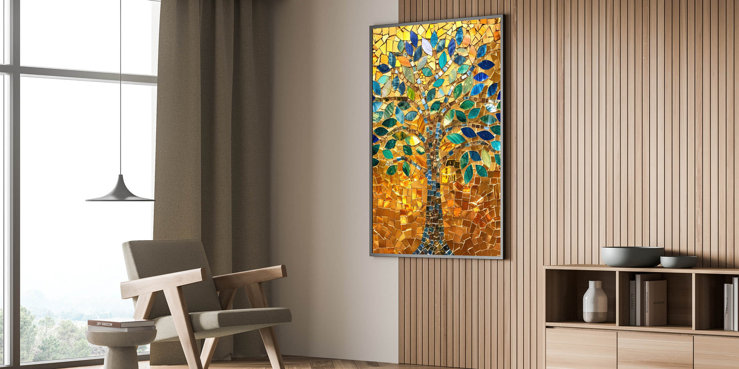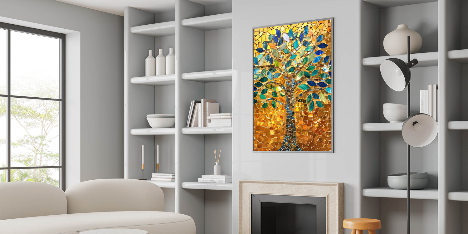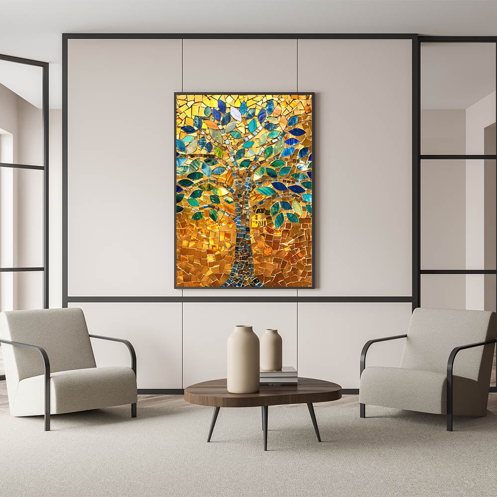 Add a burst of color to your decor with this Scenic Barcelona artwork, featuring a vibrant mosaic tree set against a golden background. The intricate mosaic design, with its bright leaves in shades of blue and green, contrasts beautifully with the shimmering gold tones, making this piece a stunning focal point for any room. This beautiful Barcelona wall decor is perfect for those who appreciate artistic craftsmanship and the city’s rich artistic heritage.