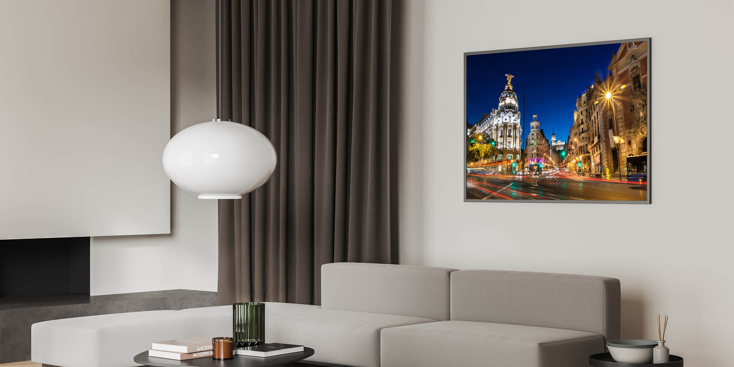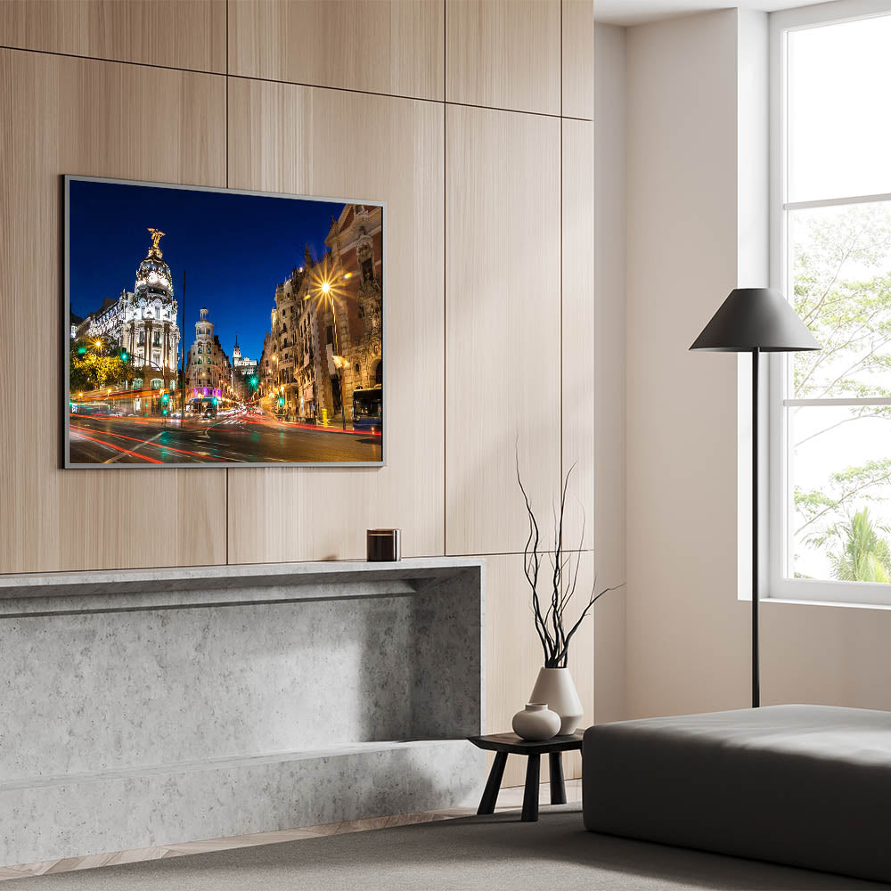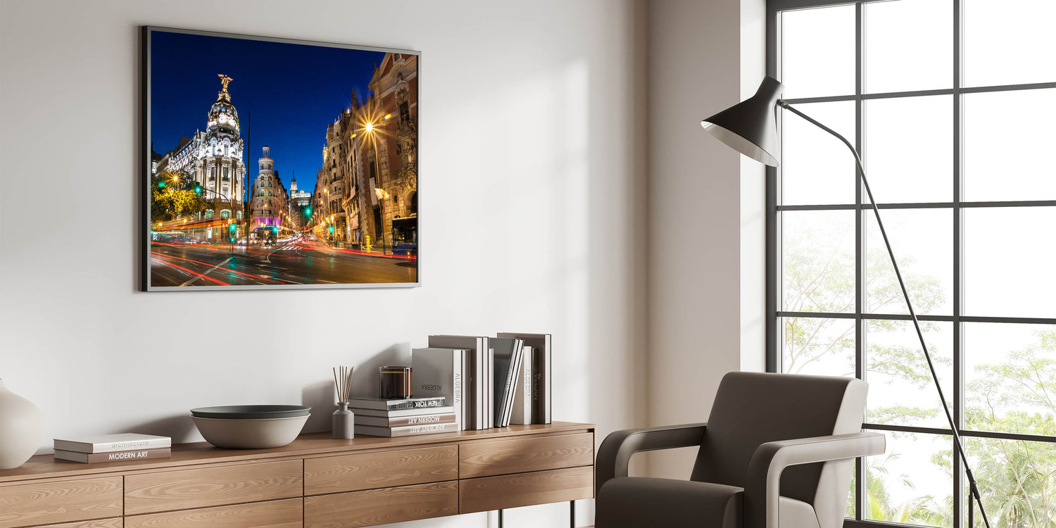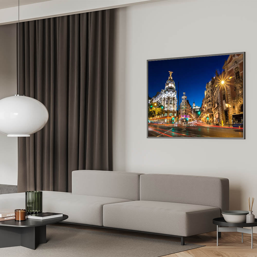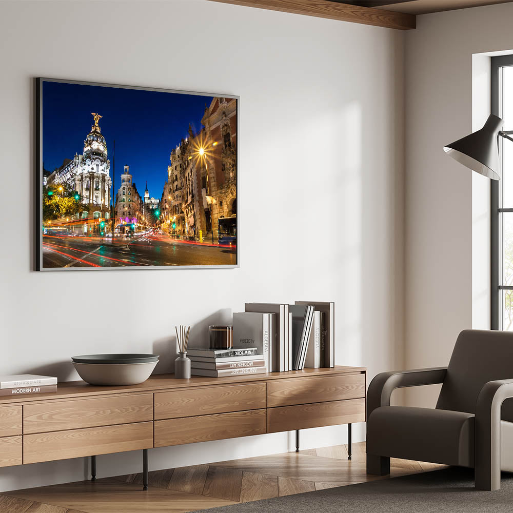 Enhance your living space with this vibrant Madrid street scene art, showcasing the iconic Gran Vía under the glow of city lights. The detailed architecture and dynamic movement of the city captured in this piece of Madrid wall decor make it a stunning addition to any room. Whether you choose a framed print, acrylic glass, or canvas, this artwork brings the energy of Madrid’s nightlife into your home or office.