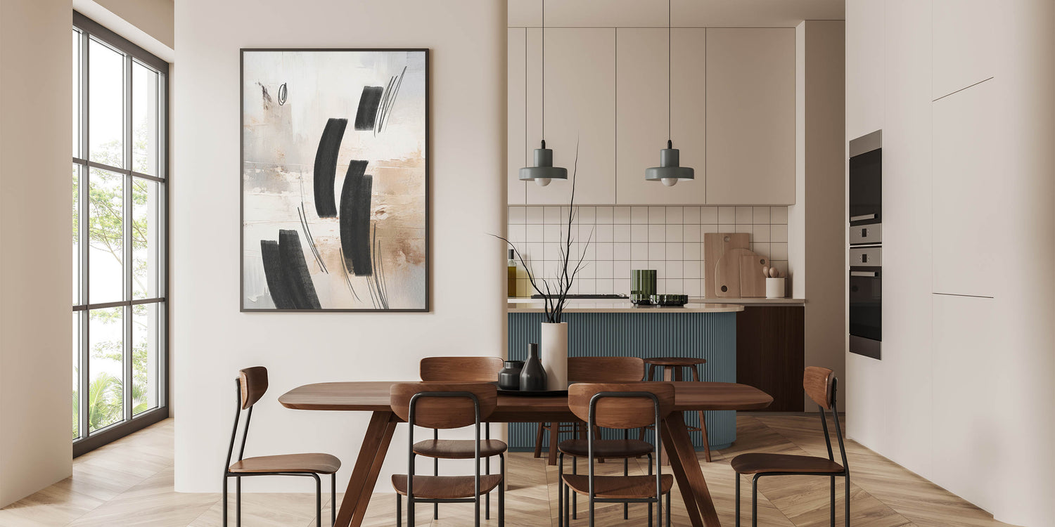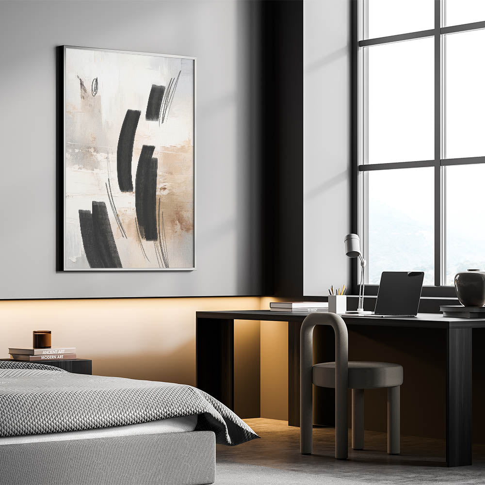 - Design: Modern abstract art with bold black brushstrokes on a textured beige and white background.