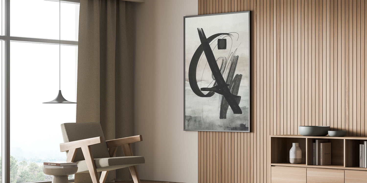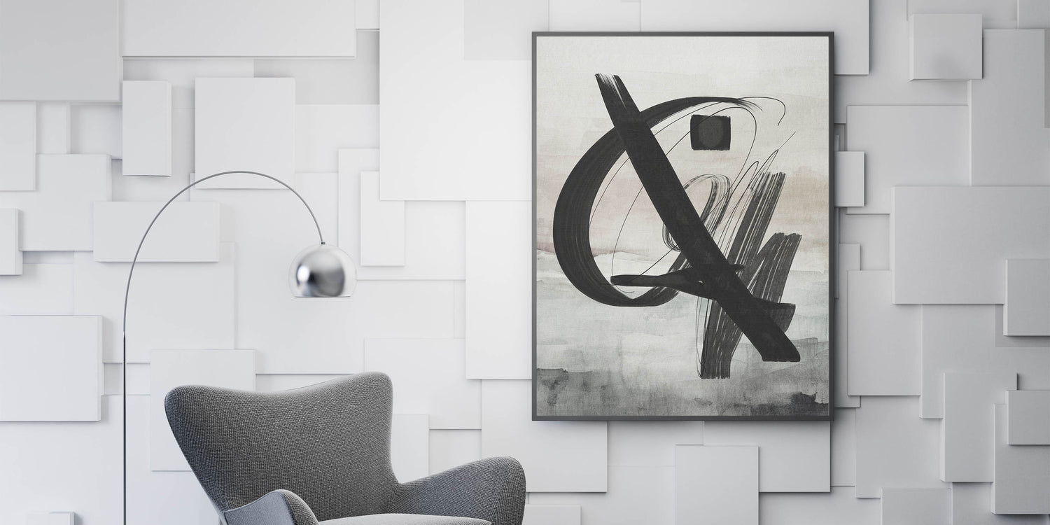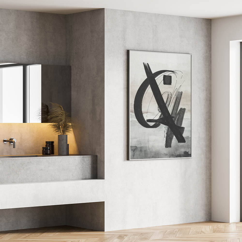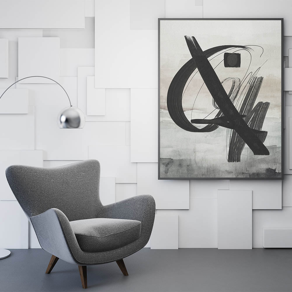 Experience the bold energy of abstract expression with this striking calligraphy-inspired wall art. Featuring dynamic black brushstrokes against a muted background of beige and gray, this artwork combines the fluidity of calligraphy with the power of abstract art. The composition exudes a sense of movement and spontaneity, making it a perfect piece for those who appreciate modern, avant-garde design. Ideal for adding a dramatic focal point to any space, this piece enhances contemporary, minimalist, and industrial interiors.