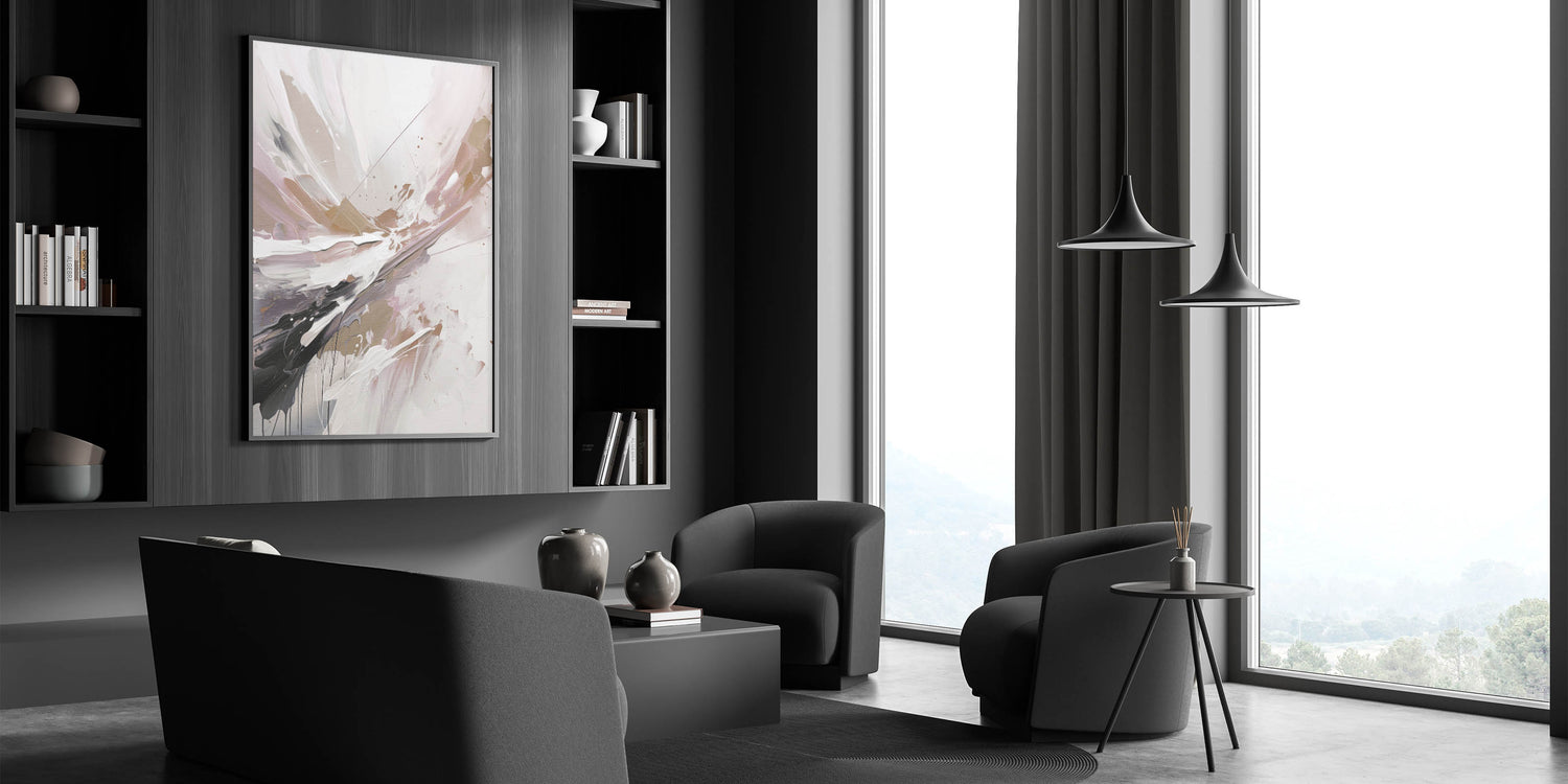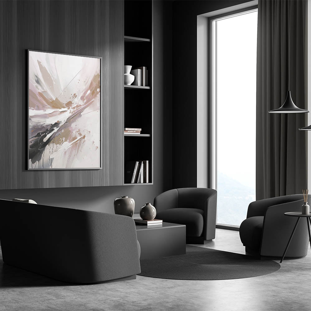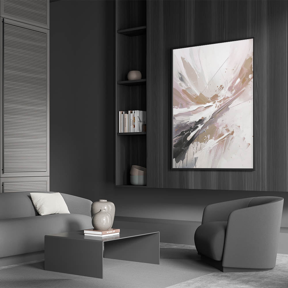 Immerse yourself in the beauty of this modern abstract wall art, featuring an expressive splash of floral-inspired colors. The dynamic composition combines soft shades of blush, beige, and white with striking strokes of black and gold, creating a harmonious blend of elegance and energy. Perfect for adding a touch of sophistication to any space, this artwork brings warmth and a contemporary flair to your home decor. Whether placed in the living room, bedroom, or office, this unique piece is sure to become a focal point of your interior design.