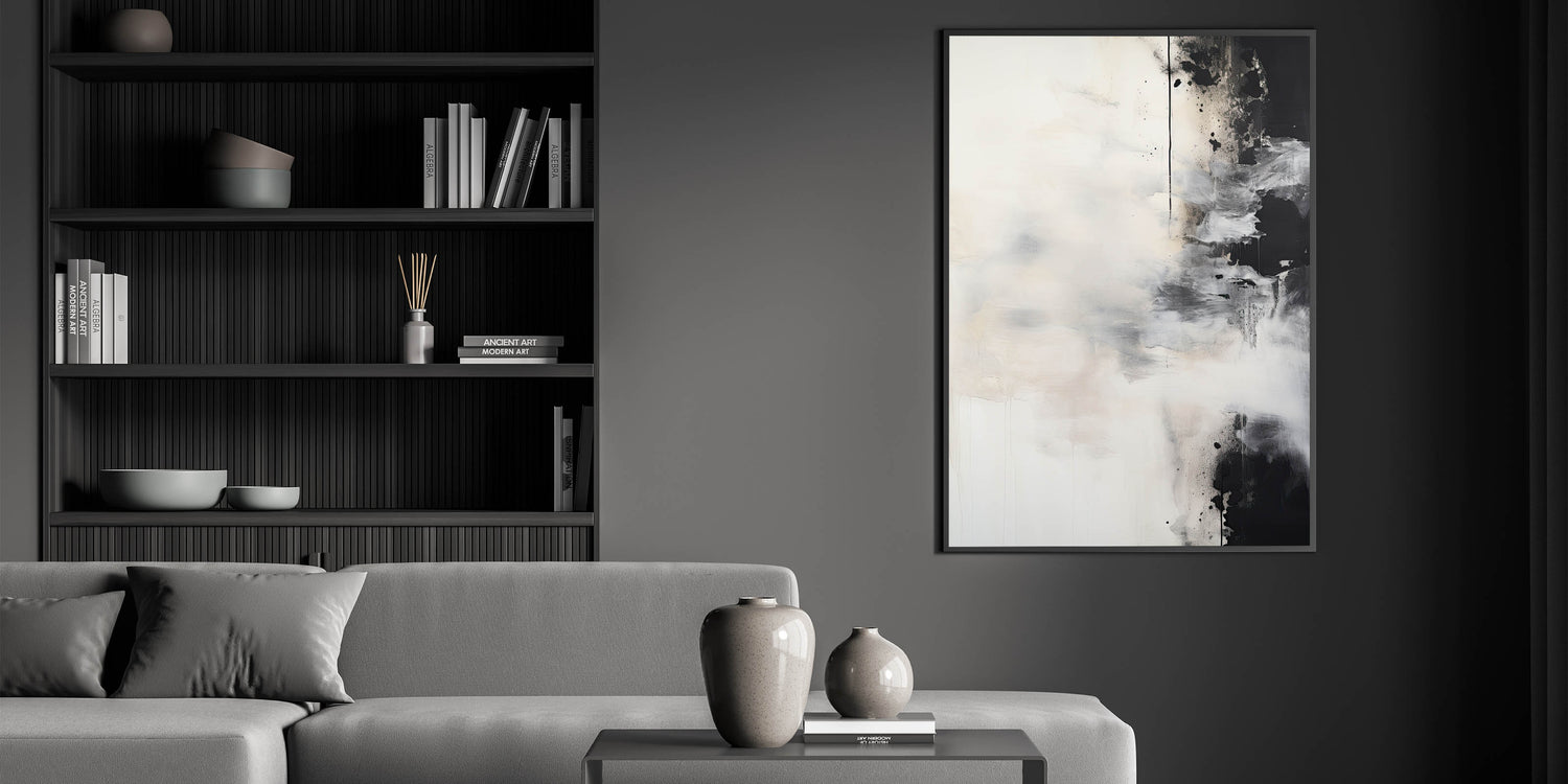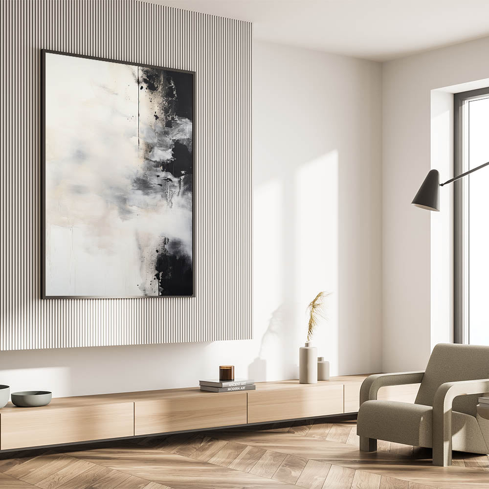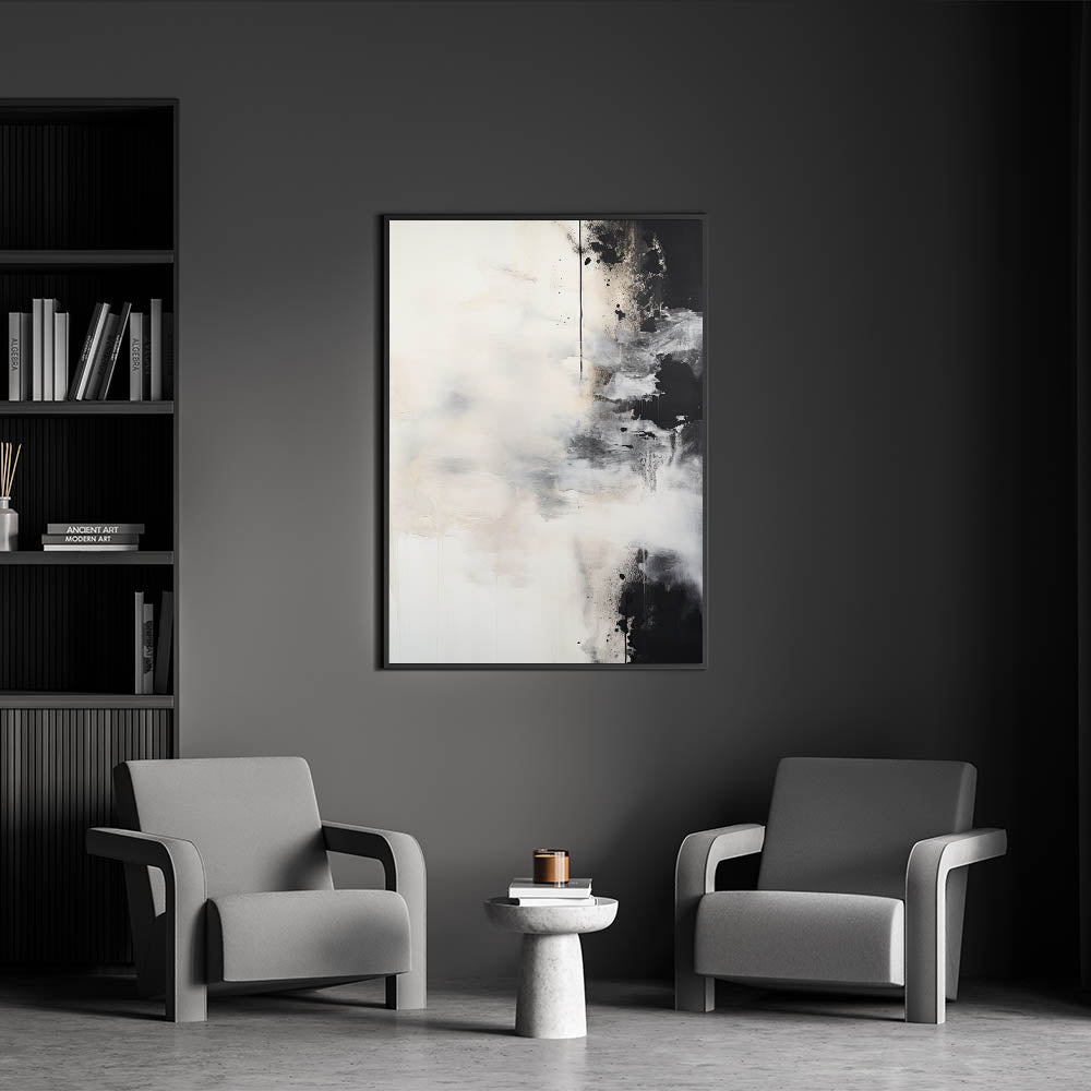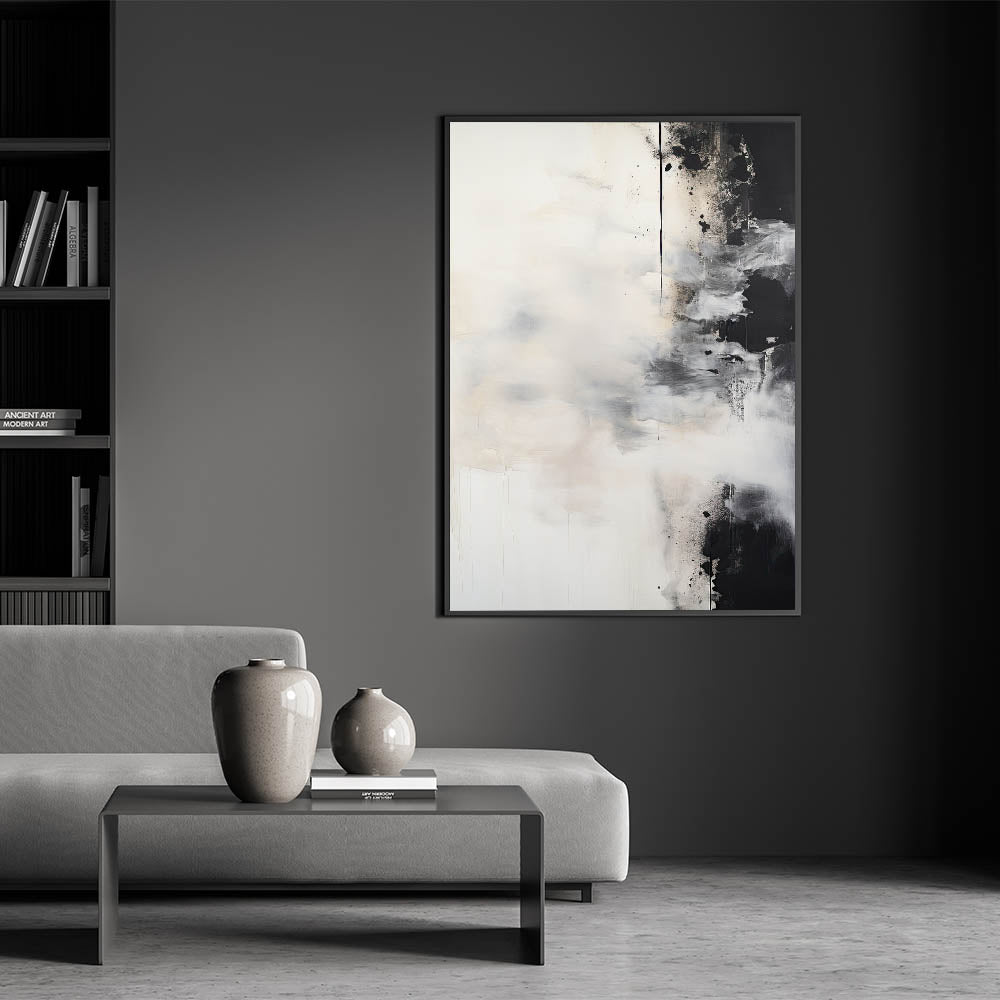 Transform your space with this striking abstract minimalist wall art, featuring soft white brushstrokes contrasted against bold black elements. The interplay of light and dark tones creates a dynamic yet serene composition, perfect for modern and contemporary interiors. This piece offers a sense of movement and depth, making it an ideal choice for living rooms, bedrooms, or office spaces that seek a bold yet calming aesthetic.