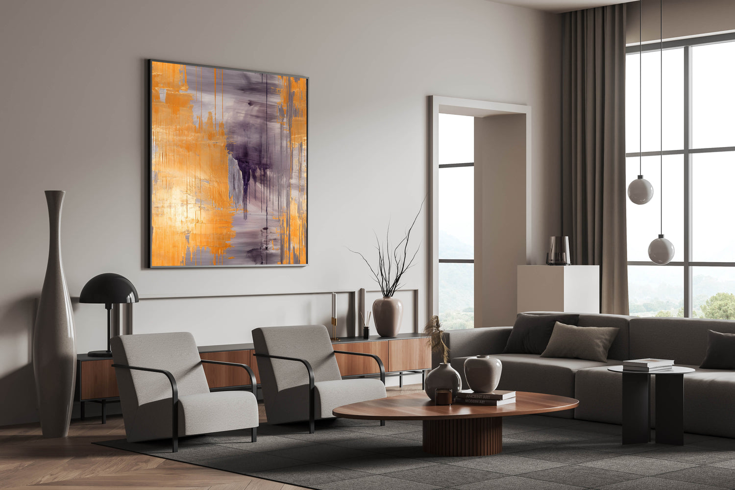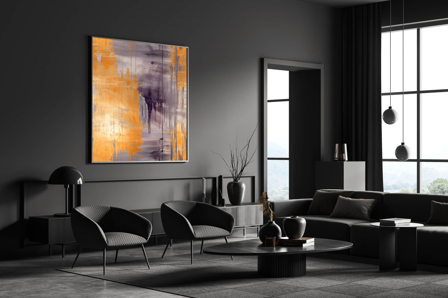 Bring a bold, dynamic look to your space with this striking abstract strokes artwork. Featuring a vibrant mix of orange, gray, and deep purple, this piece stands out with its unique drip line and brushstroke patterns. The interplay of warm and cool tones creates a visually compelling design, perfect for modern and industrial interiors. The cascading lines and textured layers add depth, making it an eye-catching focal point for any room.