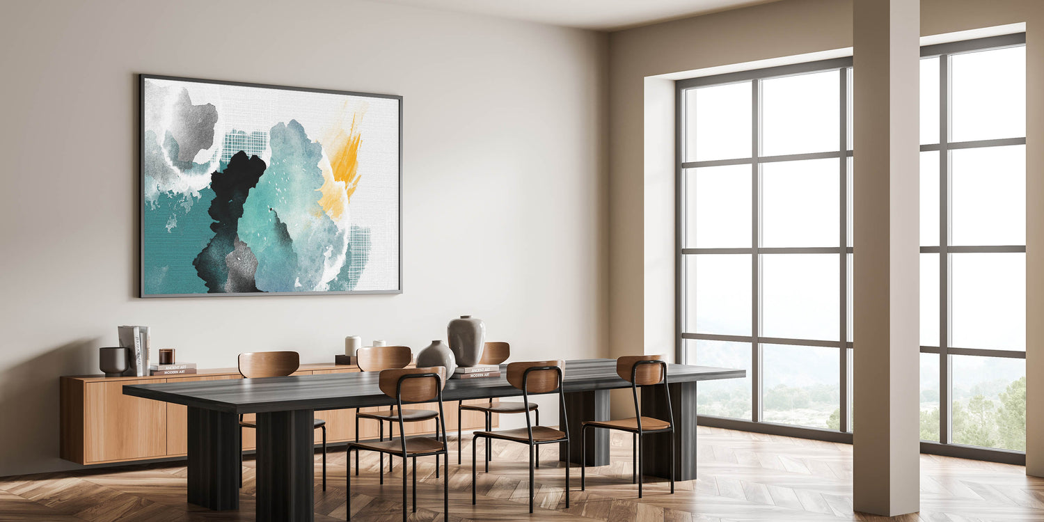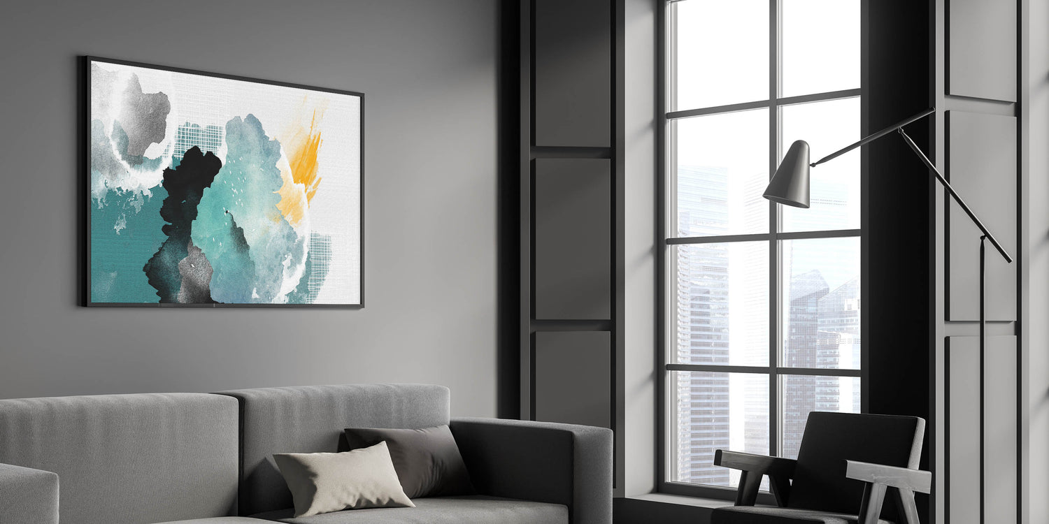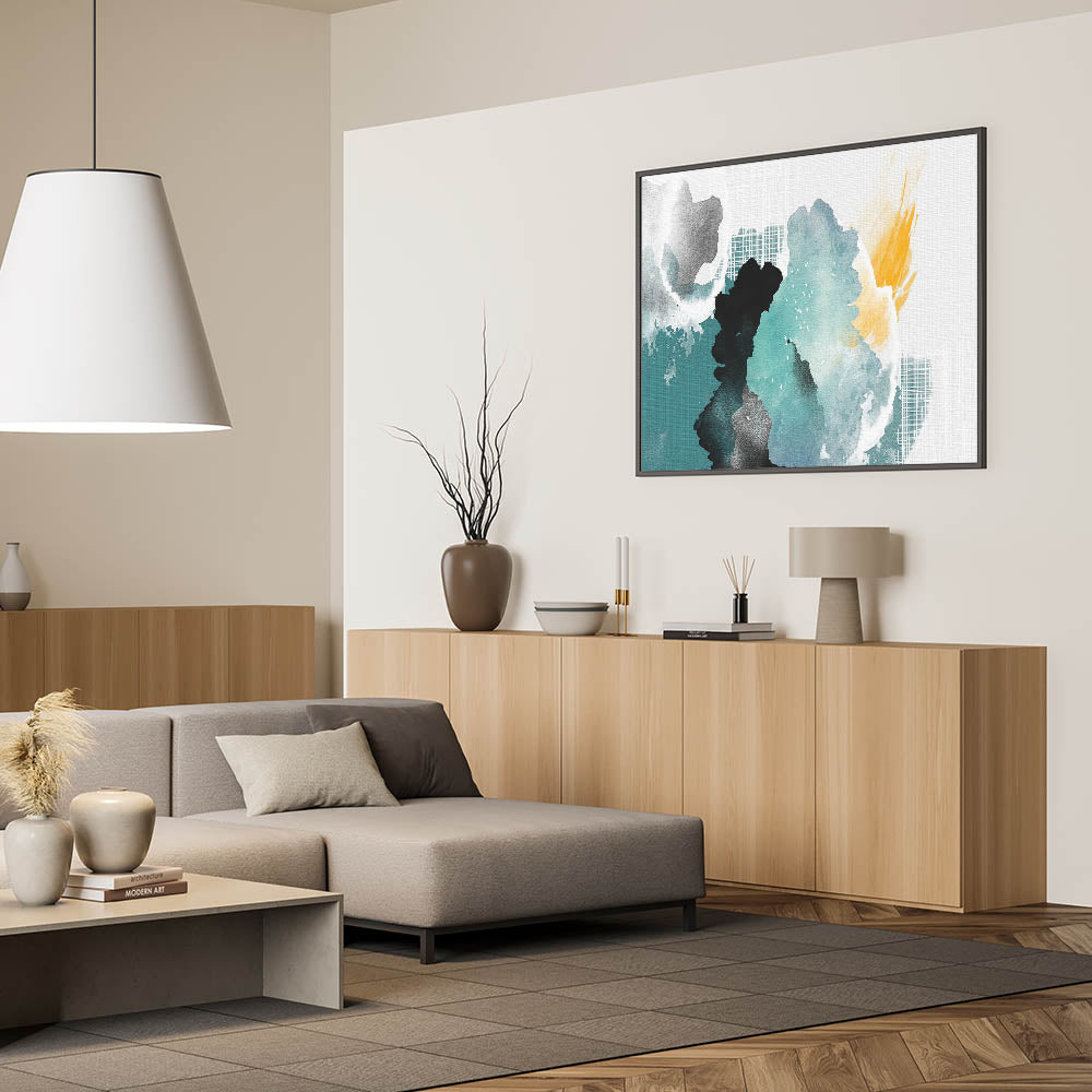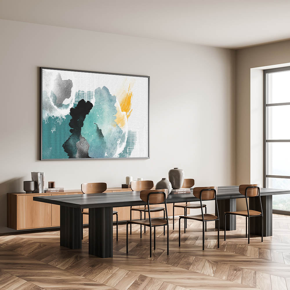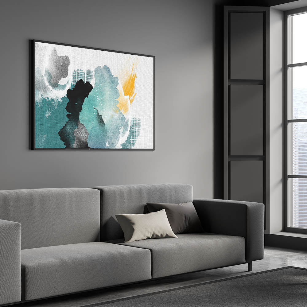 This artwork beautifully captures the fluidity and spontaneity of watercolor painting, offering a refreshing and dynamic focal point for any room. Its combination of cool aqua tones and warm yellow accents makes it a versatile piece that can complement a variety of decor styles.