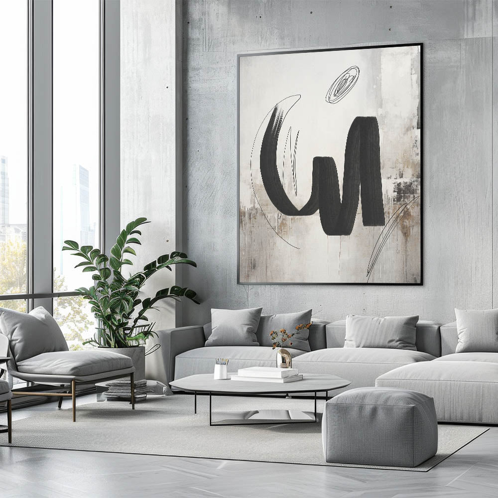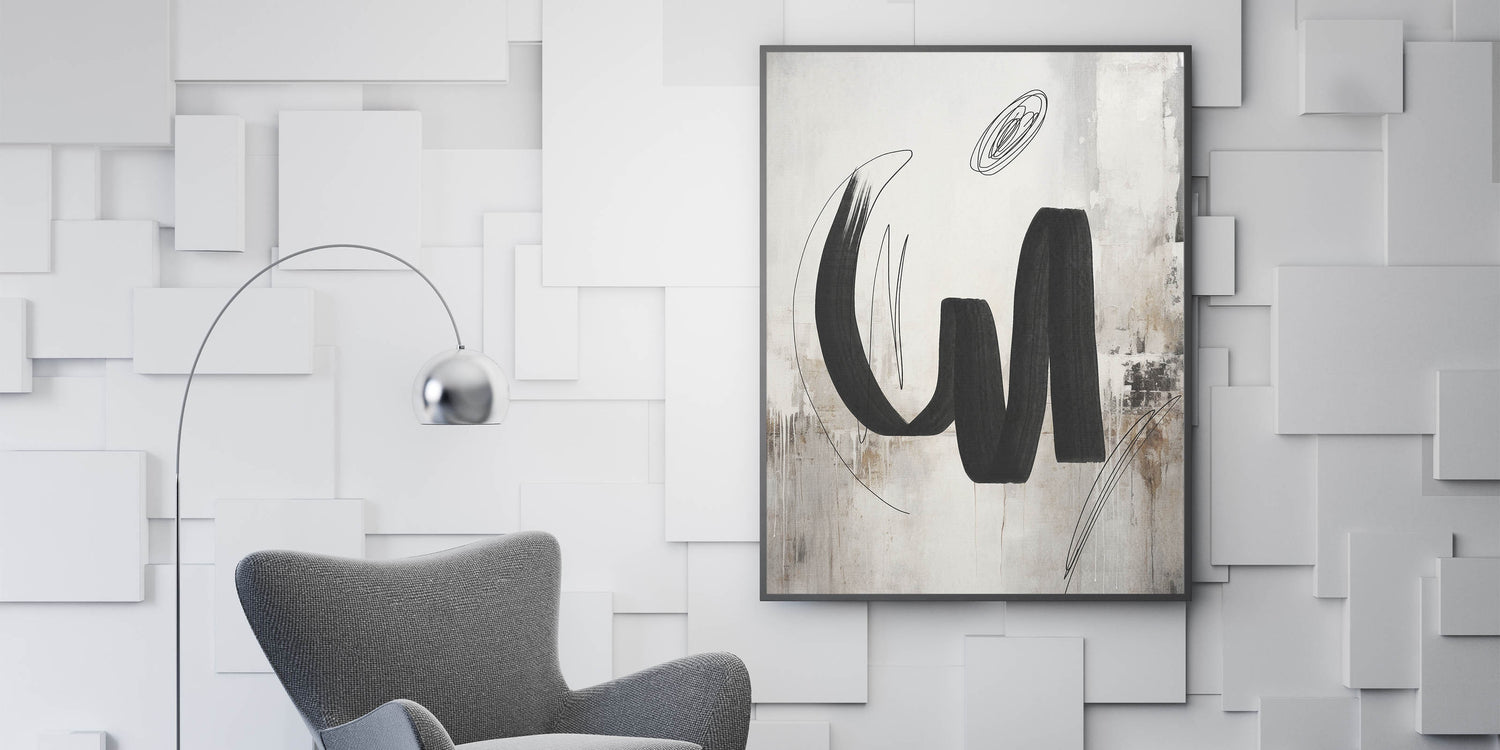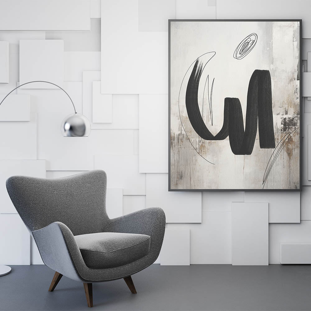 Add a bold statement to your space with this contemporary calligraphy-inspired wall art. Featuring sweeping black brushstrokes set against a textured background of beige and white, this piece blends the fluidity of calligraphy with modern abstract design. The subtle texture and dynamic lines create a sense of movement and energy, making it an ideal focal point for any room. Perfect for modern, minimalist, and industrial interiors, this artwork brings a touch of artistic sophistication to your living room, bedroom, or office.