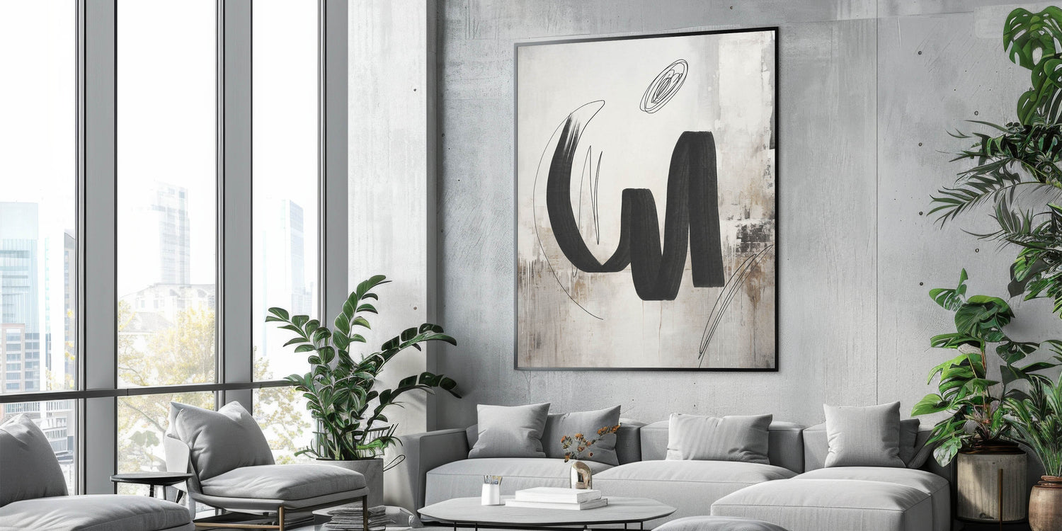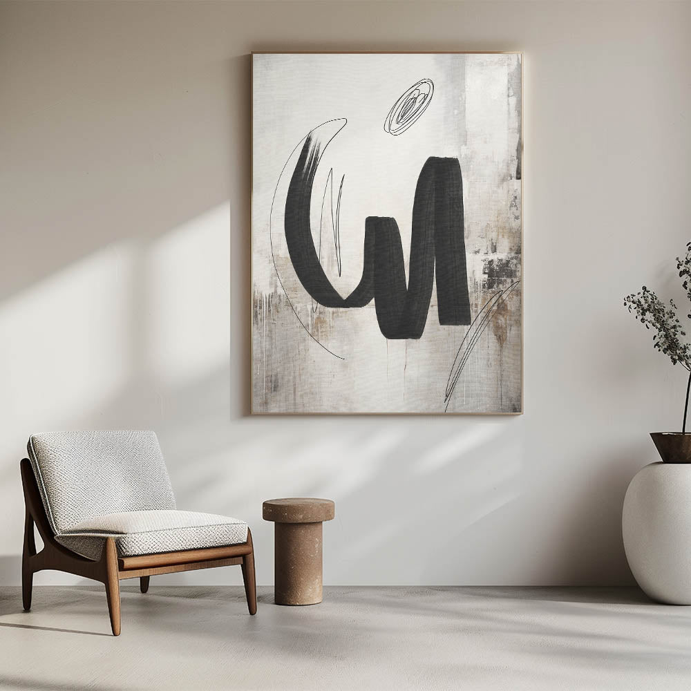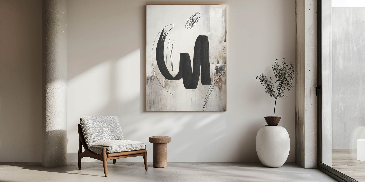 Add a bold statement to your space with this contemporary calligraphy-inspired wall art. Featuring sweeping black brushstrokes set against a textured background of beige and white, this piece blends the fluidity of calligraphy with modern abstract design. The subtle texture and dynamic lines create a sense of movement and energy, making it an ideal focal point for any room. Perfect for modern, minimalist, and industrial interiors, this artwork brings a touch of artistic sophistication to your living room, bedroom, or office.