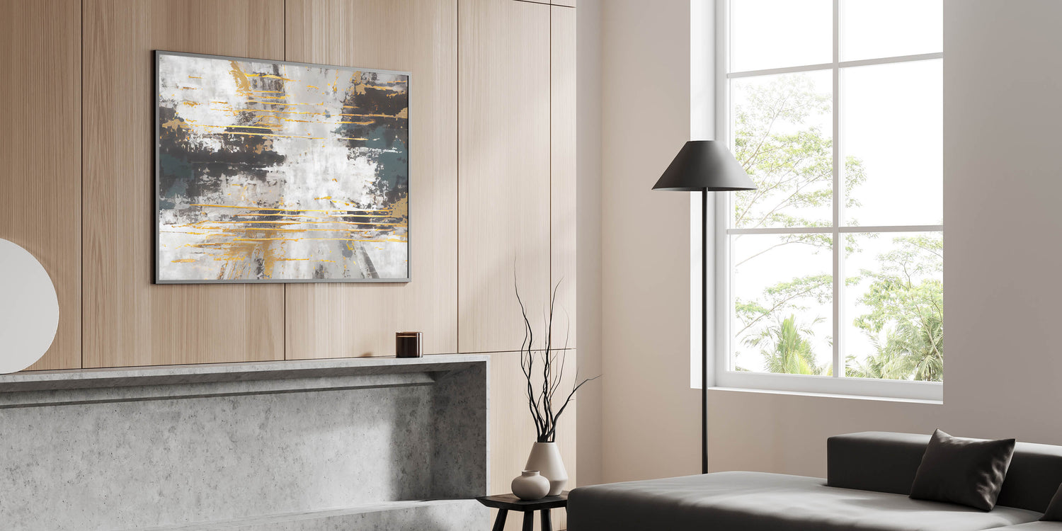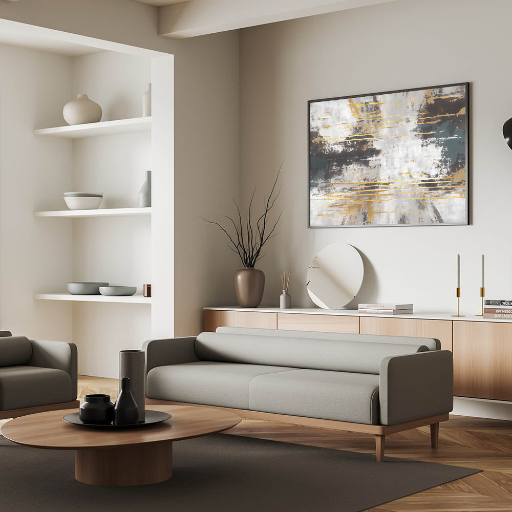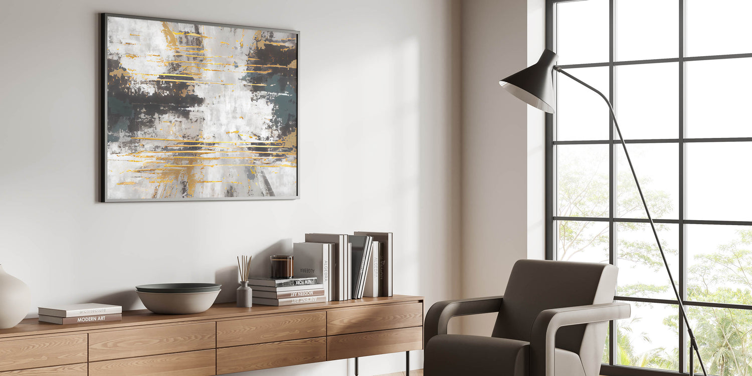 Add energy and sophistication to your space with this dynamic strokes and lines abstract art piece. The artwork features bold strokes of gold and gray, contrasted with deeper hues of black and teal. The textured layers and horizontal lines create a sense of movement and depth, making this piece a striking addition to any modern or contemporary interior.