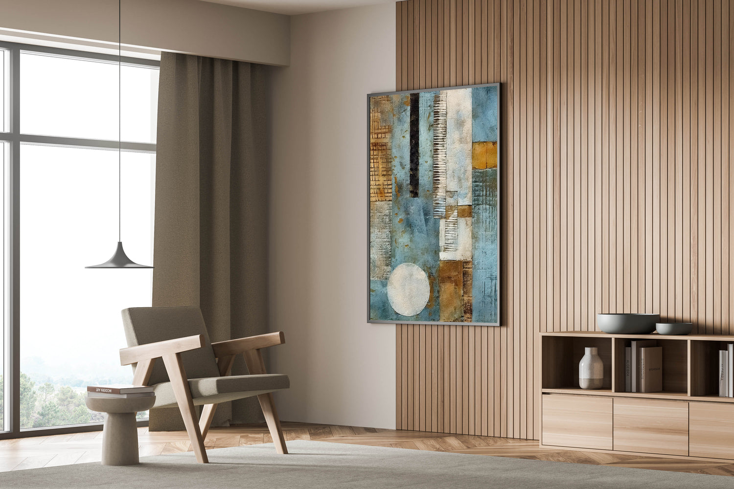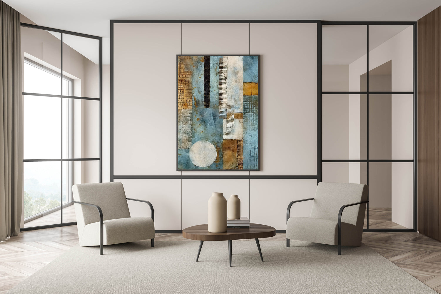 Add a dynamic touch to your space with this Geometric Abstract Line Art. This modern artwork features a striking composition of cool blue, warm gold, and earthy brown tones, creating a visually captivating piece. The layered textures and abstract shapes, including bold vertical lines and a distinct circular element, offer a sense of depth and movement, making it a standout addition to any room.