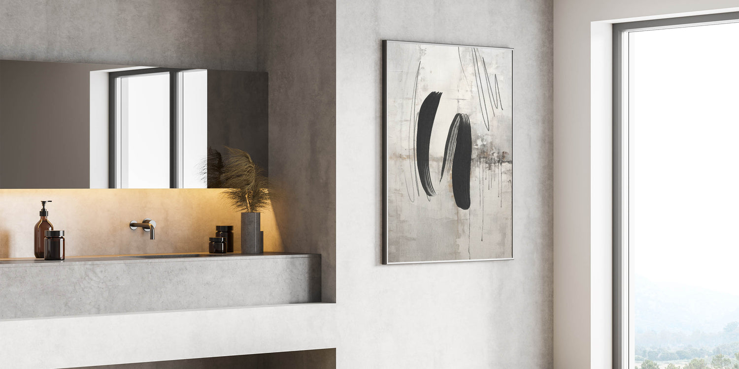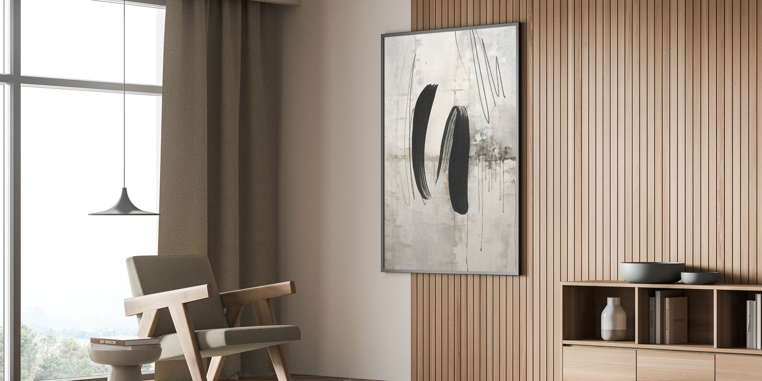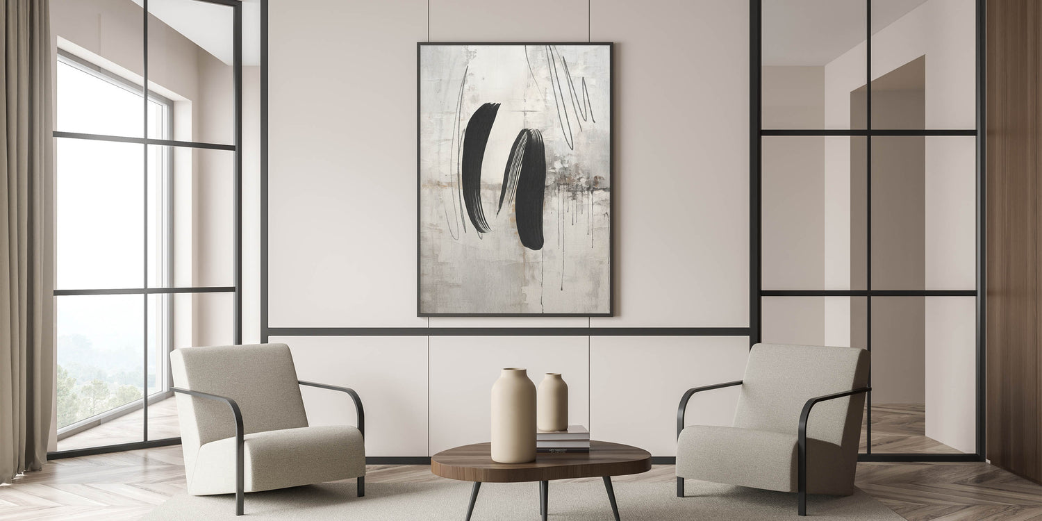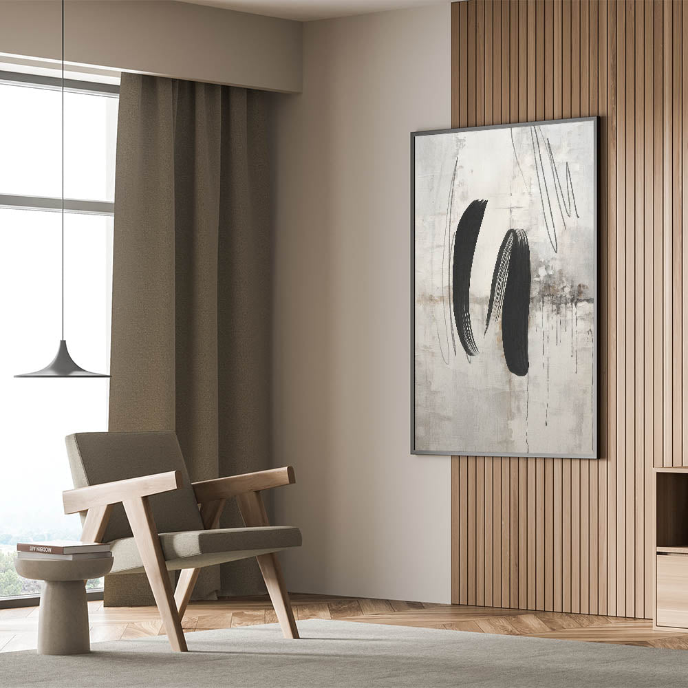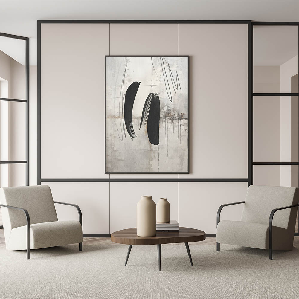 - Design: Modern abstract painting with bold black brushstrokes on a textured gray and beige background.