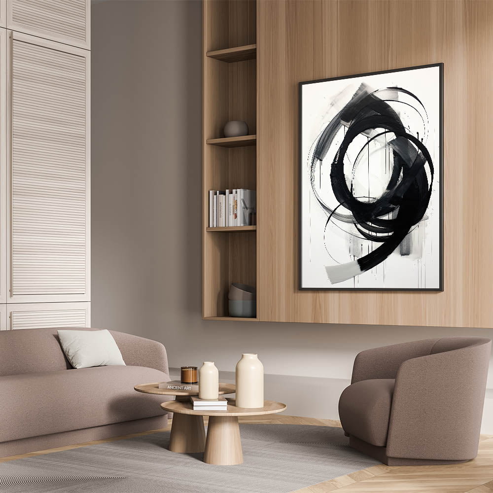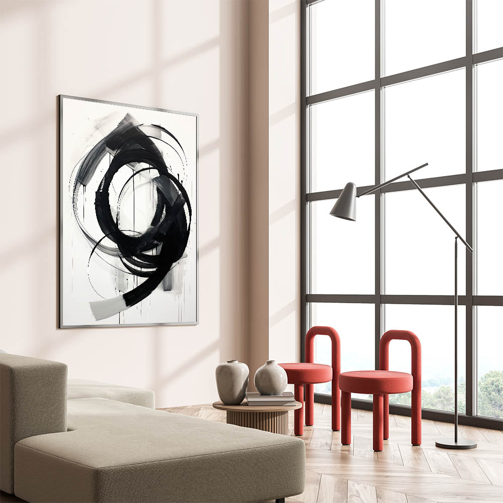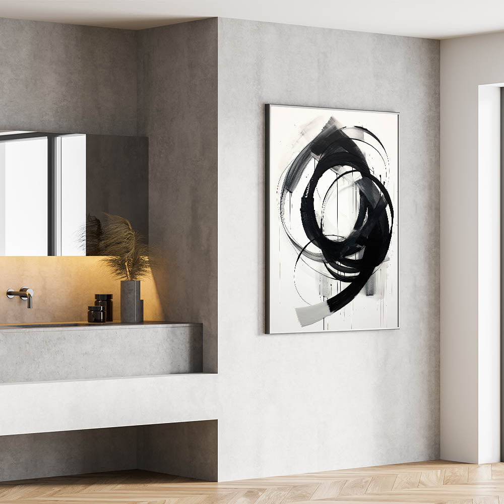 This bold minimalist abstract wall art features dynamic black brushstrokes set against a crisp white background. The expressive and flowing circular strokes create a sense of movement and energy, making this piece a captivating focal point for any room. Perfect for modern and minimalist interiors, the simplicity of black and white adds a sophisticated touch, while the fluid design brings visual interest and depth.