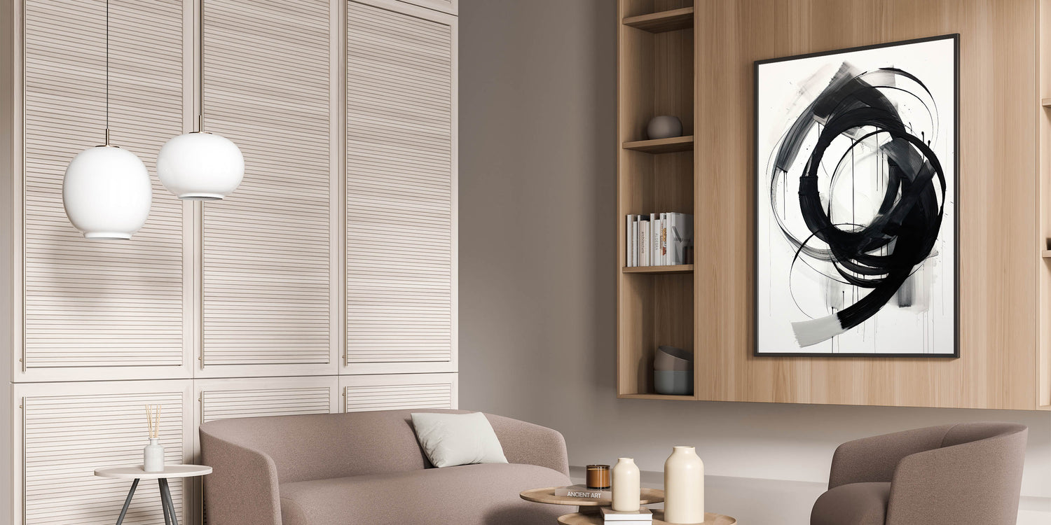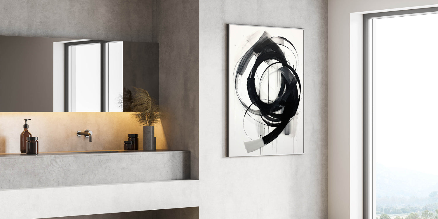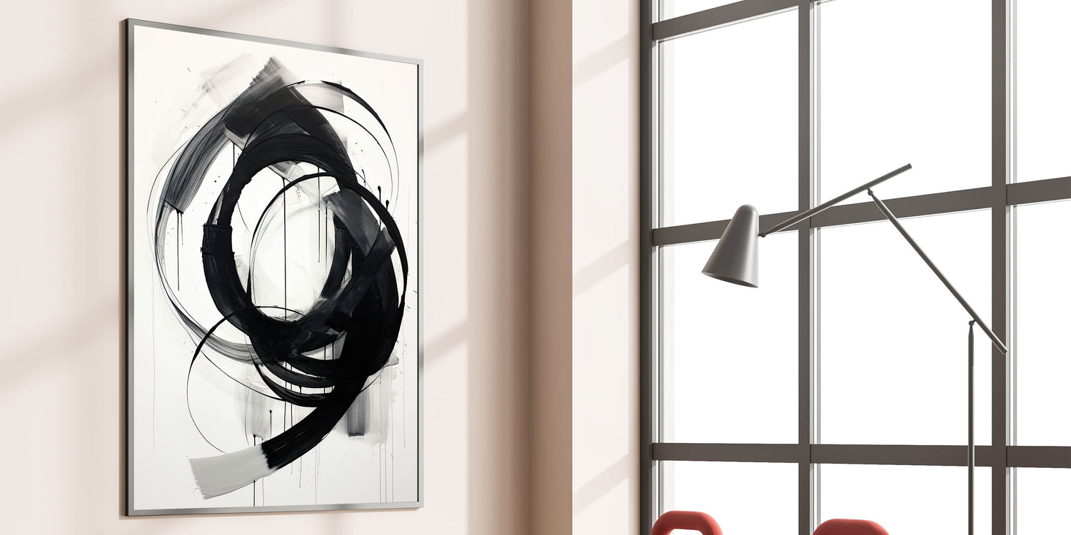 This bold minimalist abstract wall art features dynamic black brushstrokes set against a crisp white background. The expressive and flowing circular strokes create a sense of movement and energy, making this piece a captivating focal point for any room. Perfect for modern and minimalist interiors, the simplicity of black and white adds a sophisticated touch, while the fluid design brings visual interest and depth.