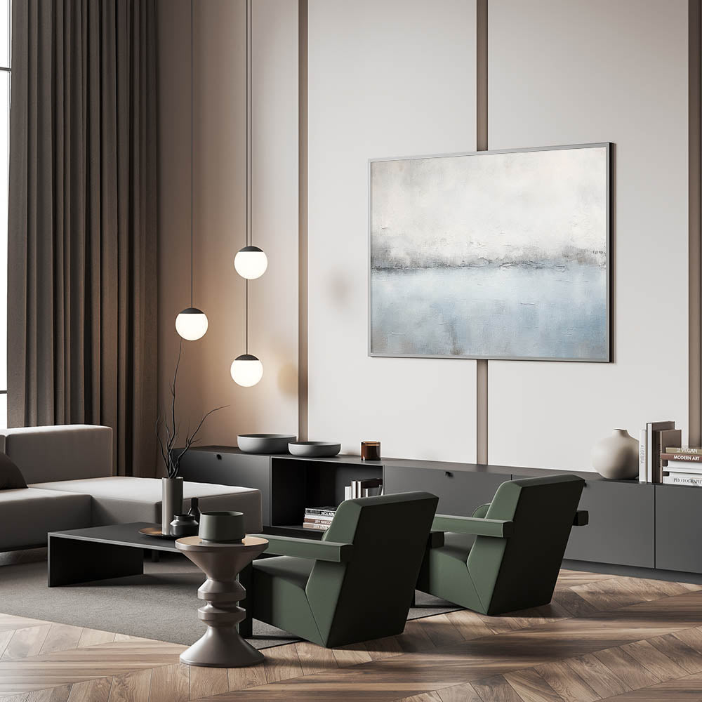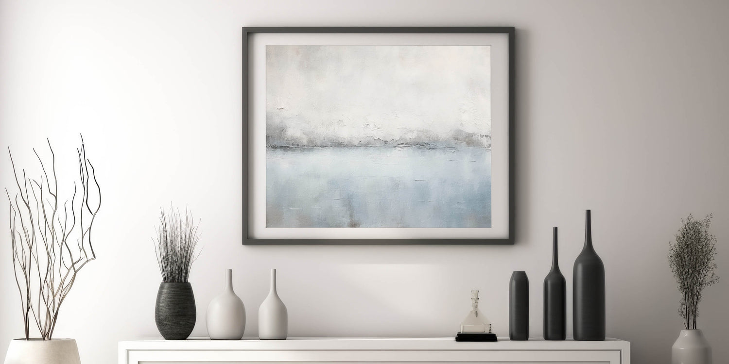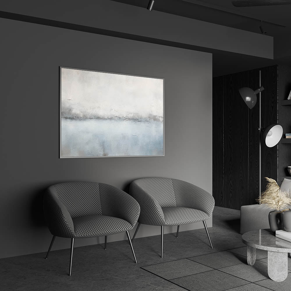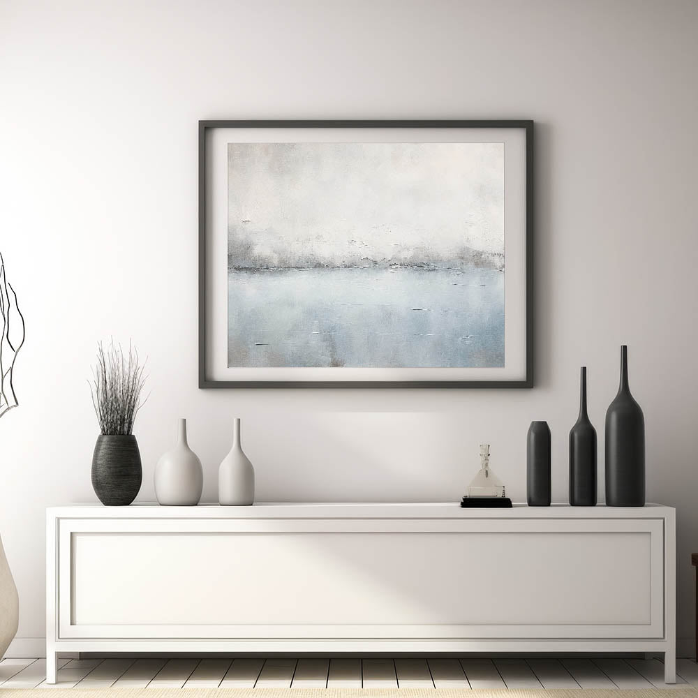 Immerse yourself in the tranquil beauty of this minimalist seascape abstract art. The artwork captures a serene horizon with soft shades of white, gray, and light blue, creating a calming and peaceful atmosphere. The delicate brush strokes and subtle textures evoke the feeling of a misty morning by the sea, making this piece perfect for those who appreciate understated elegance.