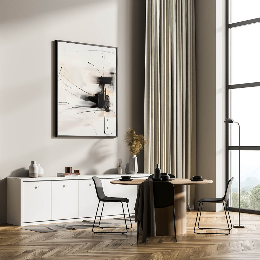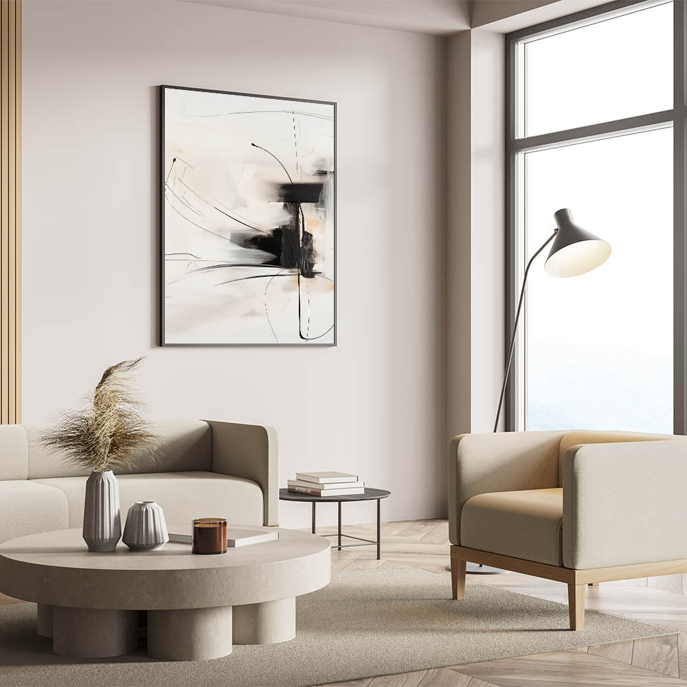 Enhance your space with this striking black and white minimalist wall art, featuring abstract lines and shapes. This artwork delivers a sense of movement and fluidity, ideal for those who love modern minimalist decor. The sweeping lines and soft touches of beige create a captivating yet understated look, perfect for contemporary homes or offices.
