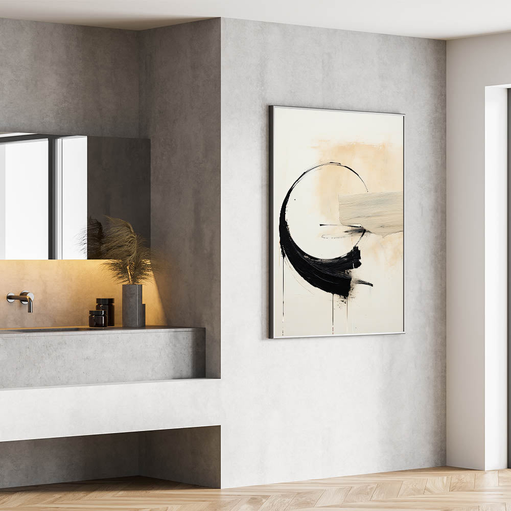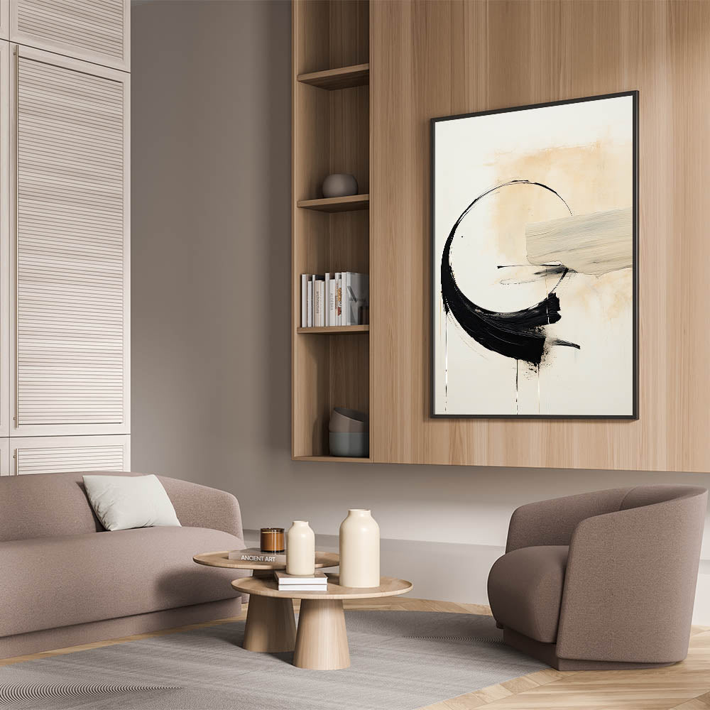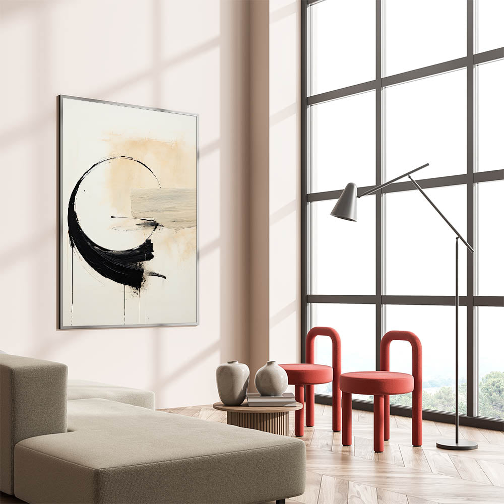 Elevate your space with this captivating minimalist wall art, featuring an elegant blend of abstract lines and forms. The subtle beige tones combined with bold black brushstrokes create a striking yet balanced composition, making it ideal for modern minimalist decor. This piece perfectly embodies clean, contemporary design with its harmonious mix of curves and textures.