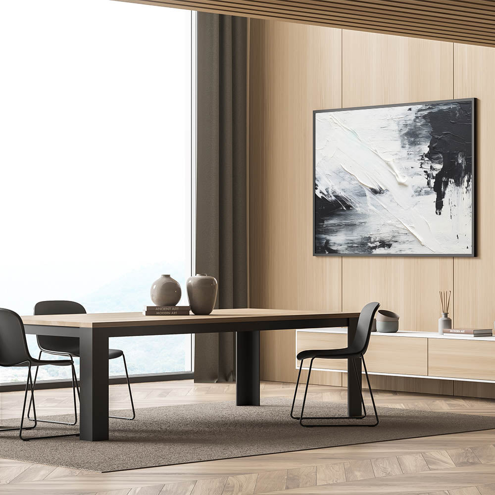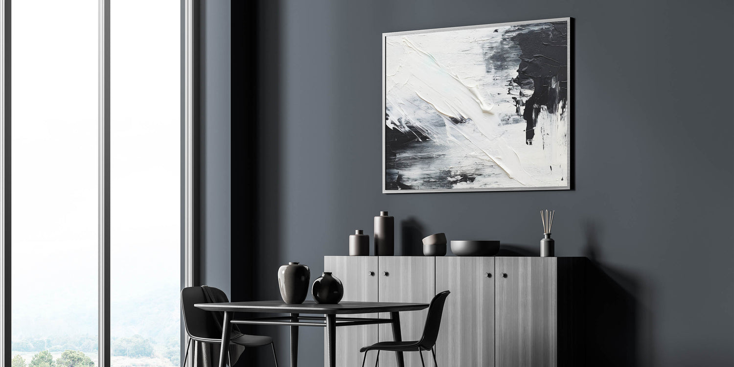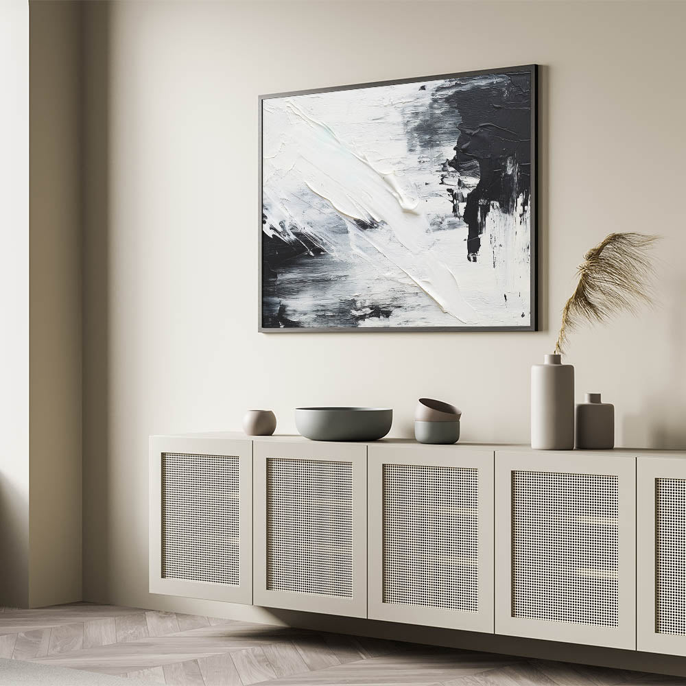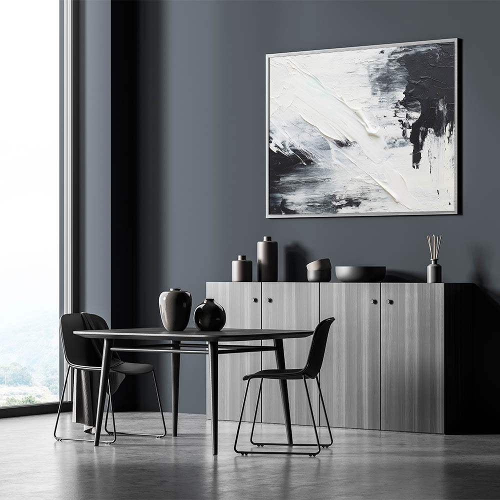 Introduce a touch of modern sophistication to your space with this striking black and white abstract canvas. This unique monochrome art piece features bold, textured strokes of black and white, creating a dramatic visual contrast that will enhance any interior decor.