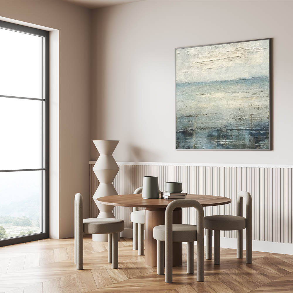 Enhance your living space with this tranquil abstract landscape art, featuring calming shades of blue and gray. The artwork captures the peaceful essence of nature, resembling a misty shoreline with soft, muted colors and a textured finish. Ideal for creating a serene ambiance, this modern landscape art is perfect for contemporary interiors seeking a touch of refined elegance.
