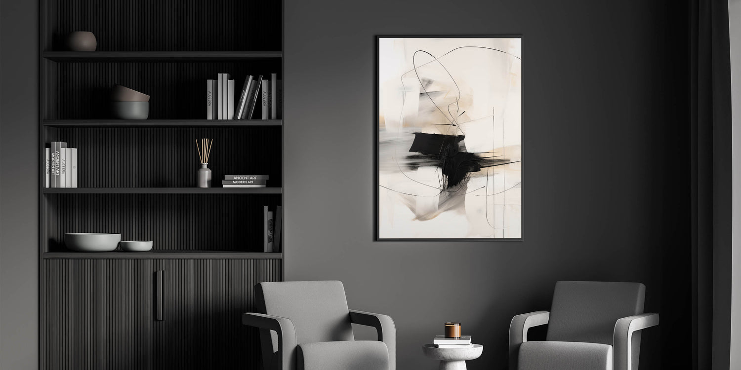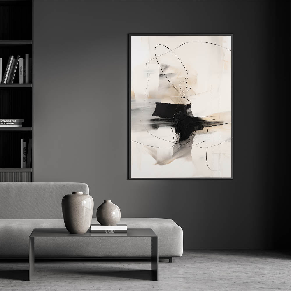 Transform your space with this modern minimalist wall art, featuring an abstract composition of bold black brushstrokes and elegant line work against a neutral background. This piece exemplifies minimalist design with its clean lines and soft, flowing shapes, making it a versatile addition to contemporary homes or offices. Perfect for those seeking stylish, minimalist home decor, this artwork will elevate the aesthetic of any room with its sophisticated simplicity.