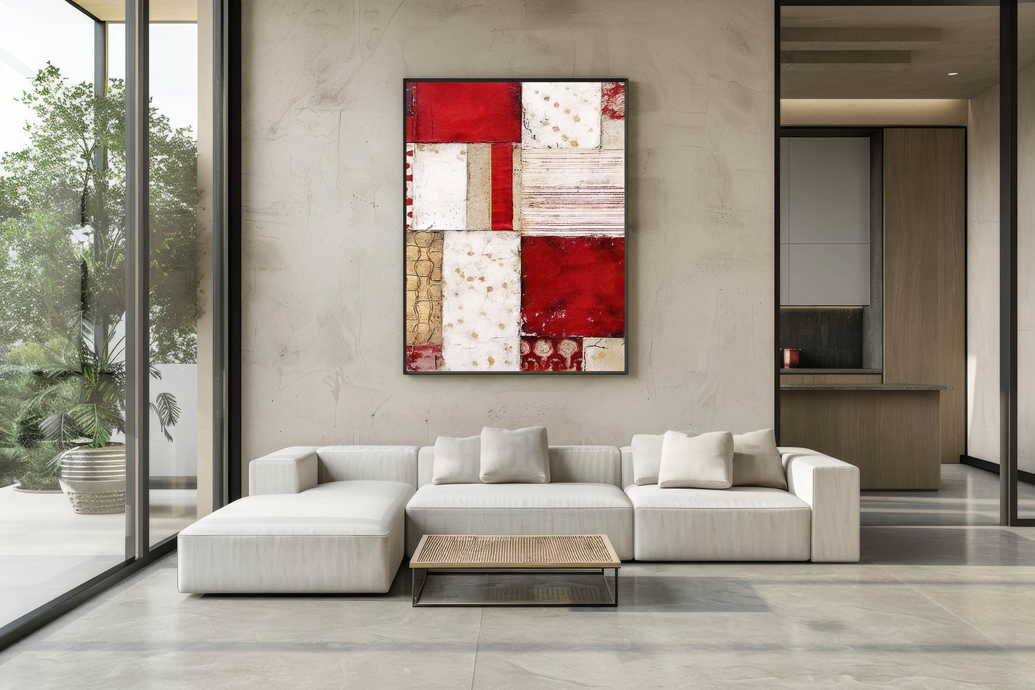 Make a statement with this Patchwork Abstract Line Art. Featuring a vibrant mix of red, gold, and beige, this artwork showcases a dynamic patchwork design with textured patterns and bold geometric accents. The interplay of warm, rich tones and intricate detailing gives the piece a rustic yet elegant feel, making it an ideal choice for adding visual interest to any room.