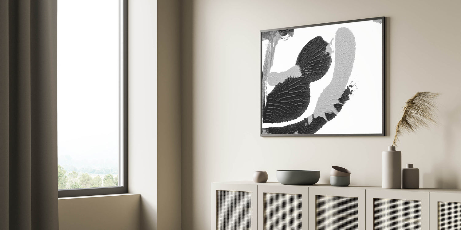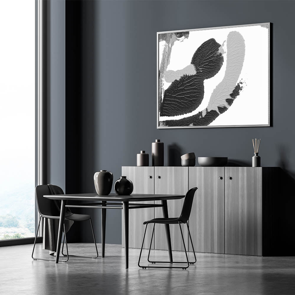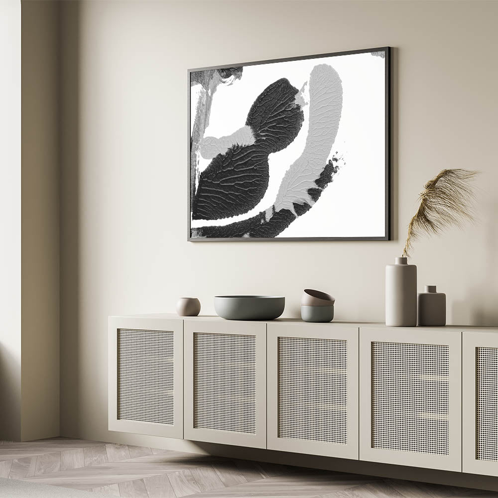 Enhance your living space with this textured black and white abstract art piece. Featuring intricate monochrome textures, this design brings a sophisticated and modern touch to any room.