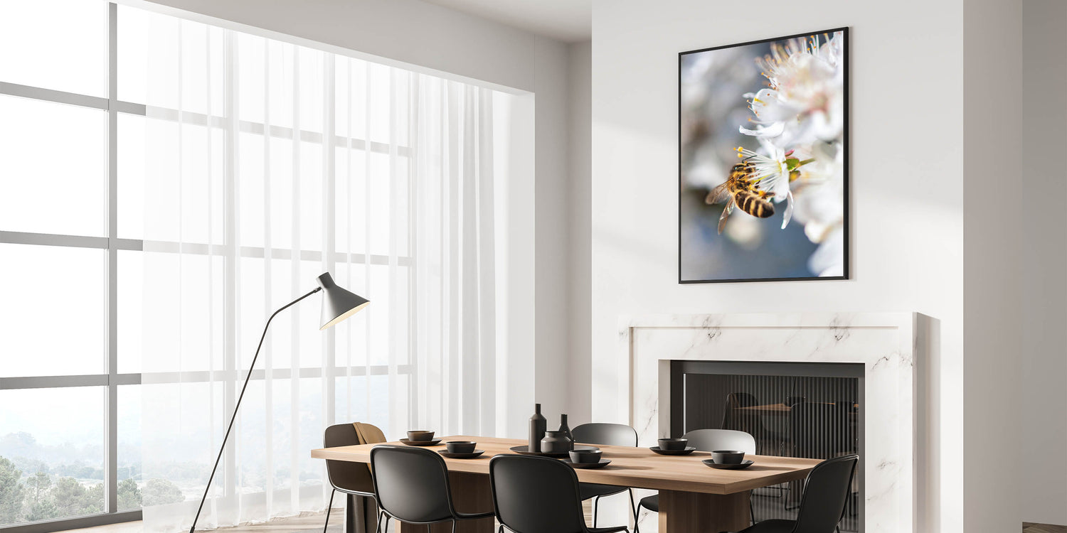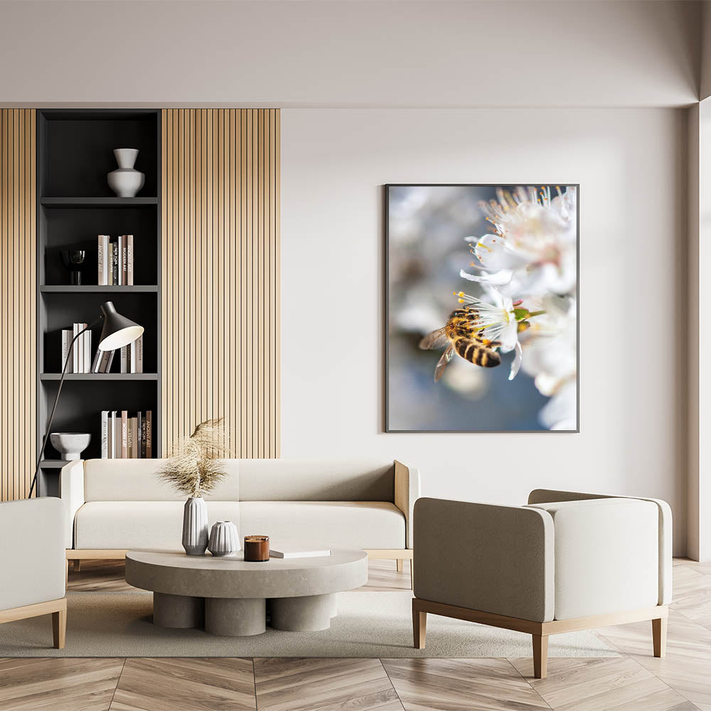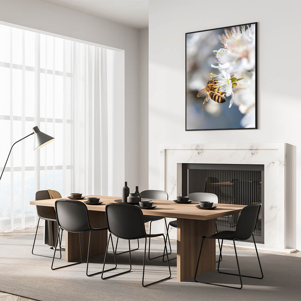 Celebrate the beauty of nature with this exquisite Spring Wall Art, capturing a close-up of a bee delicately collecting nectar from a white blossom. The fine details of the bee’s golden stripes, translucent wings, and the flower’s delicate stamens create a mesmerizing composition that highlights the harmony between nature and pollinators. The soft white petals against a blurred background add depth and elegance, making this Spring Canvas Art a stunning addition to any space. Perfect for nature lovers, this piece brings a touch of organic beauty to living rooms, bedrooms, offices, or reading nooks.