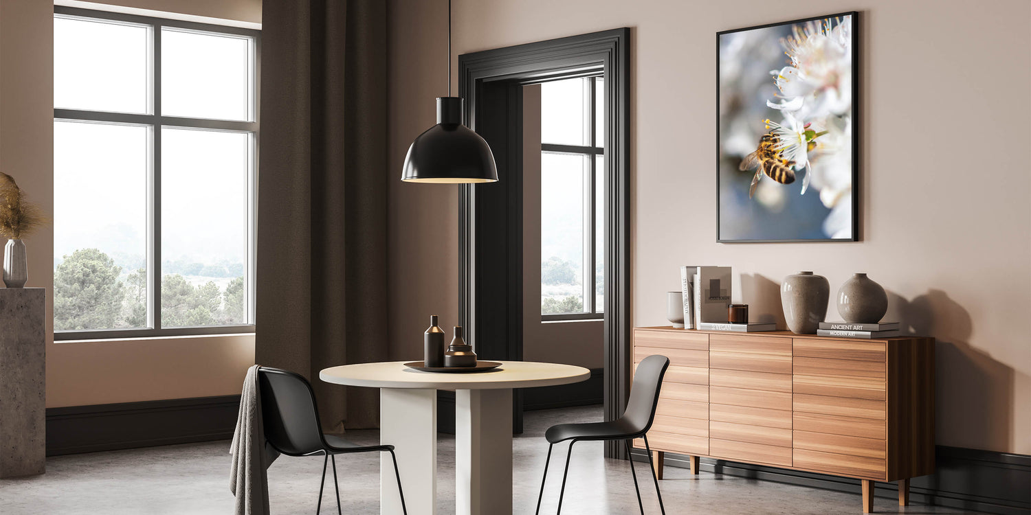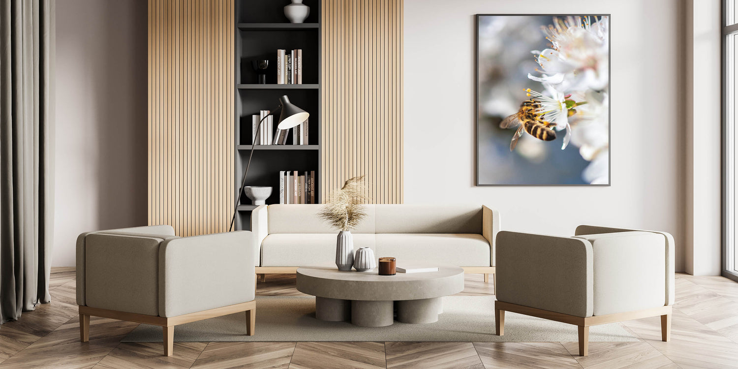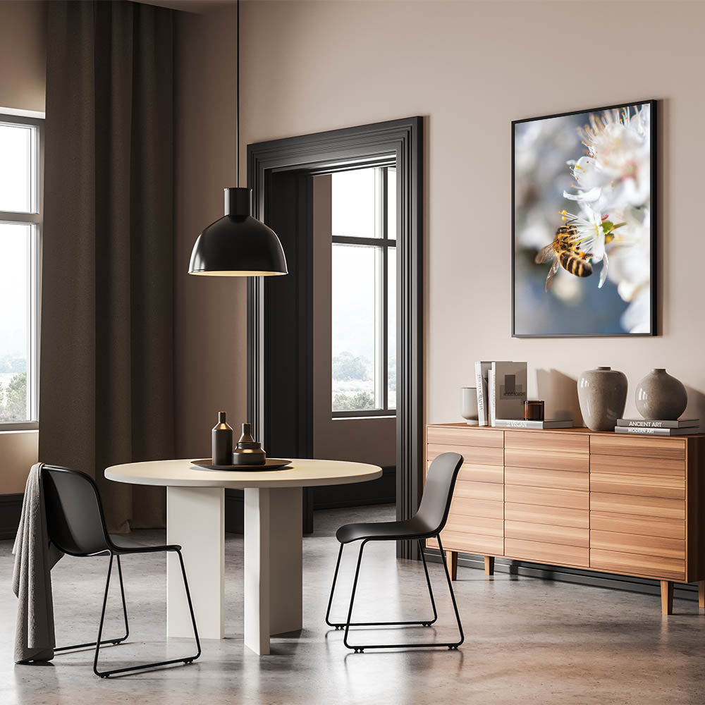 Celebrate the beauty of nature with this exquisite Spring Wall Art, capturing a close-up of a bee delicately collecting nectar from a white blossom. The fine details of the bee’s golden stripes, translucent wings, and the flower’s delicate stamens create a mesmerizing composition that highlights the harmony between nature and pollinators. The soft white petals against a blurred background add depth and elegance, making this Spring Canvas Art a stunning addition to any space. Perfect for nature lovers, this piece brings a touch of organic beauty to living rooms, bedrooms, offices, or reading nooks.