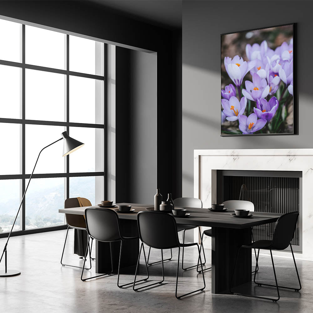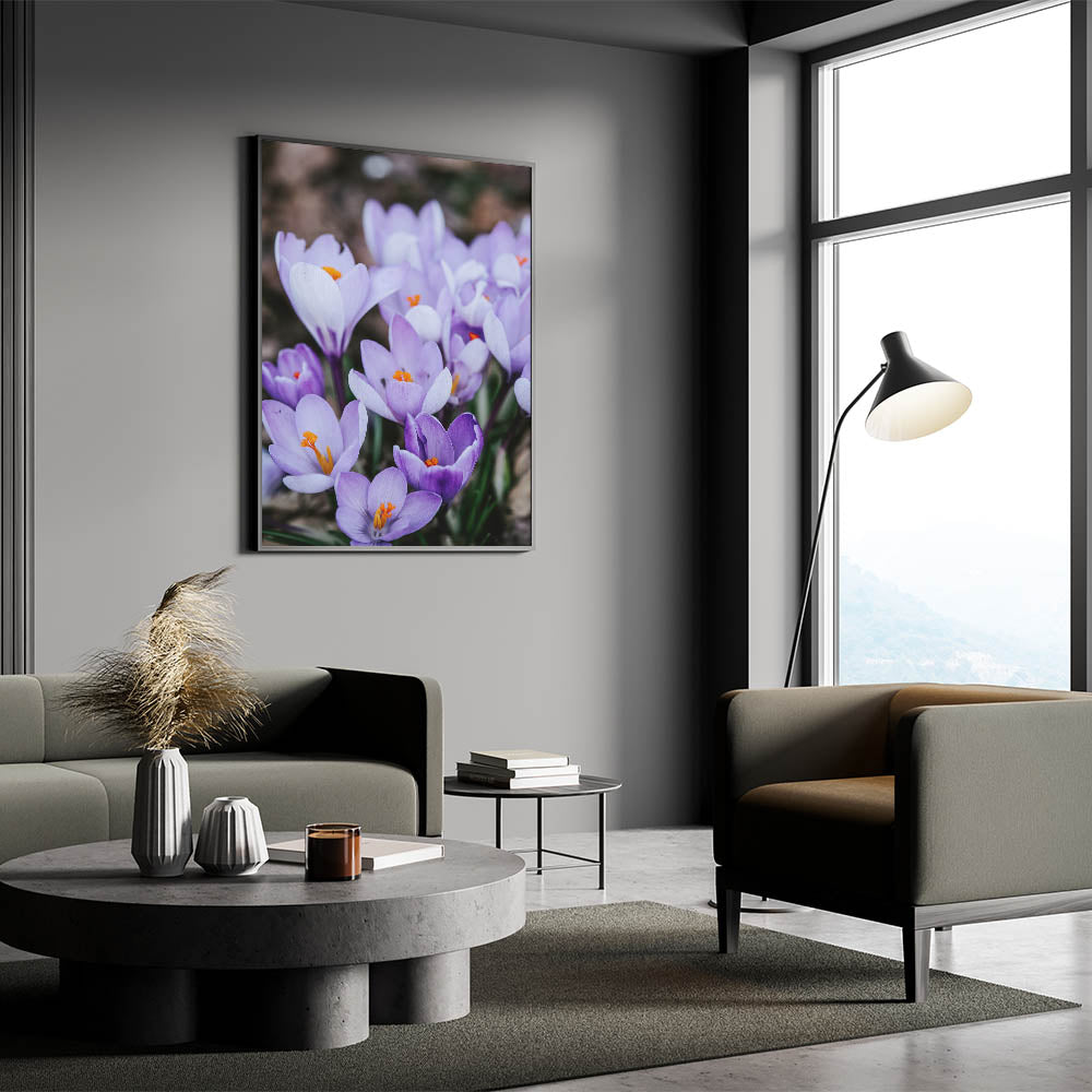 Celebrate the beauty of early spring with this stunning botanical wall art, featuring a cluster of delicate purple crocus flowers in full bloom. This Spring Canvas Art captures the vibrant petals and bright orange stamens, creating a rich and elegant floral composition that embodies the renewal of the season. The soft natural lighting enhances the graceful details of the flowers, making this artwork a perfect choice for floral enthusiasts and nature lovers.