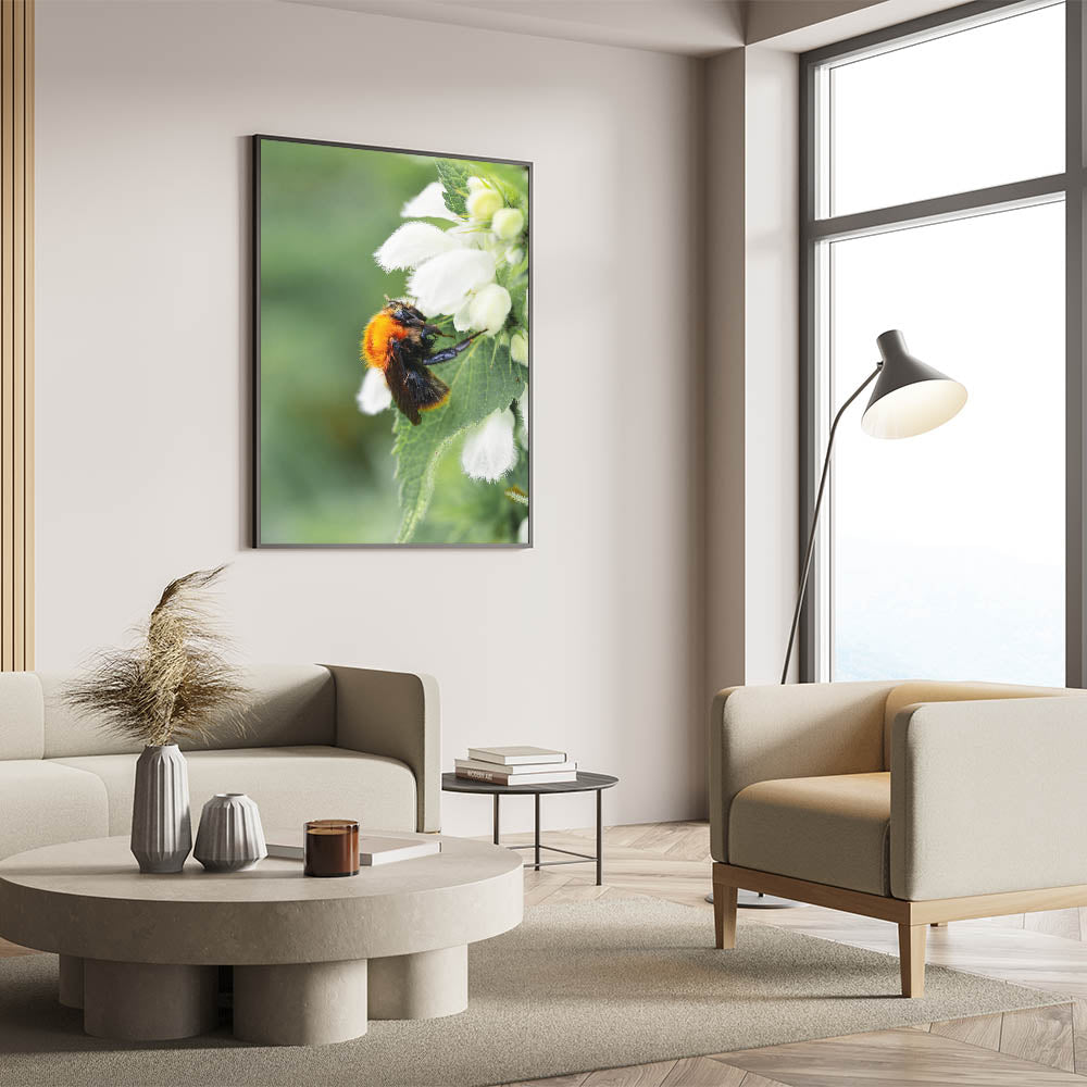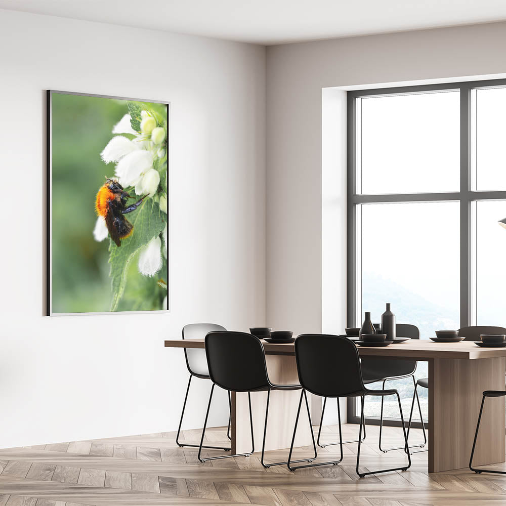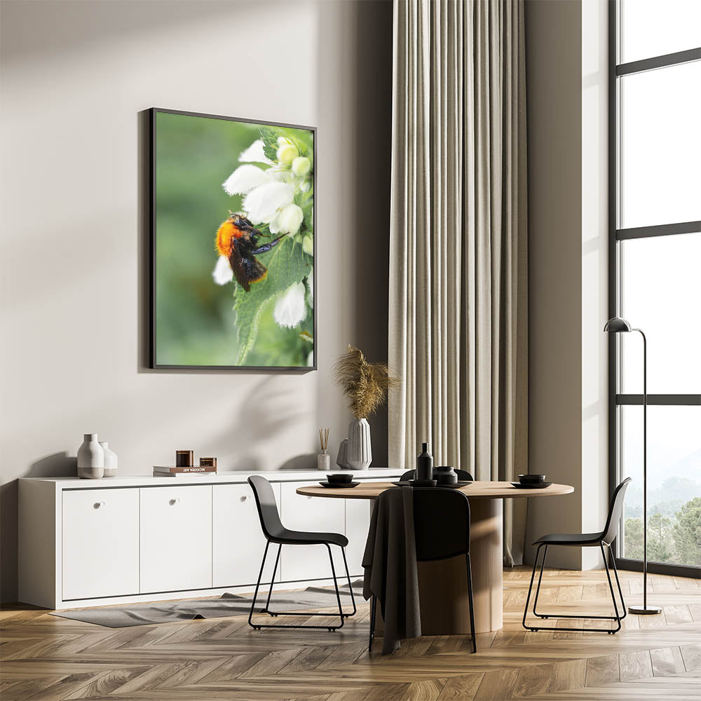 Capture the essence of spring with this stunning Spring Wall Art, featuring a vibrant bumblebee pollinating delicate white flowers. This close-up macro shot highlights the intricate details of nature, from the bee’s fuzzy orange and black coat to the soft petals of the blossoms. The harmonious blend of green, white, and golden hues creates a visually striking composition that radiates life and energy. This Botanical Wall Art is perfect for anyone who appreciates the beauty of nature and the importance of pollinators in our ecosystem.