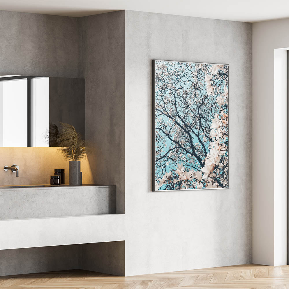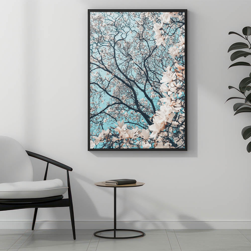 Celebrate the beauty of nature with this stunning spring wall art, featuring delicate white magnolia blossoms against a soft blue sky. The contrast between the intricate branches and the blooming flowers creates a visually captivating piece that adds elegance and serenity to any space. This spring canvas art is perfect for those who appreciate nature-inspired decor with a modern and sophisticated touch.