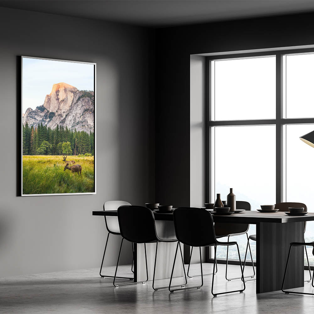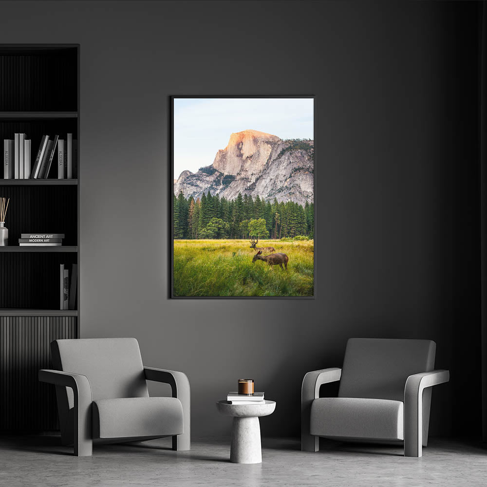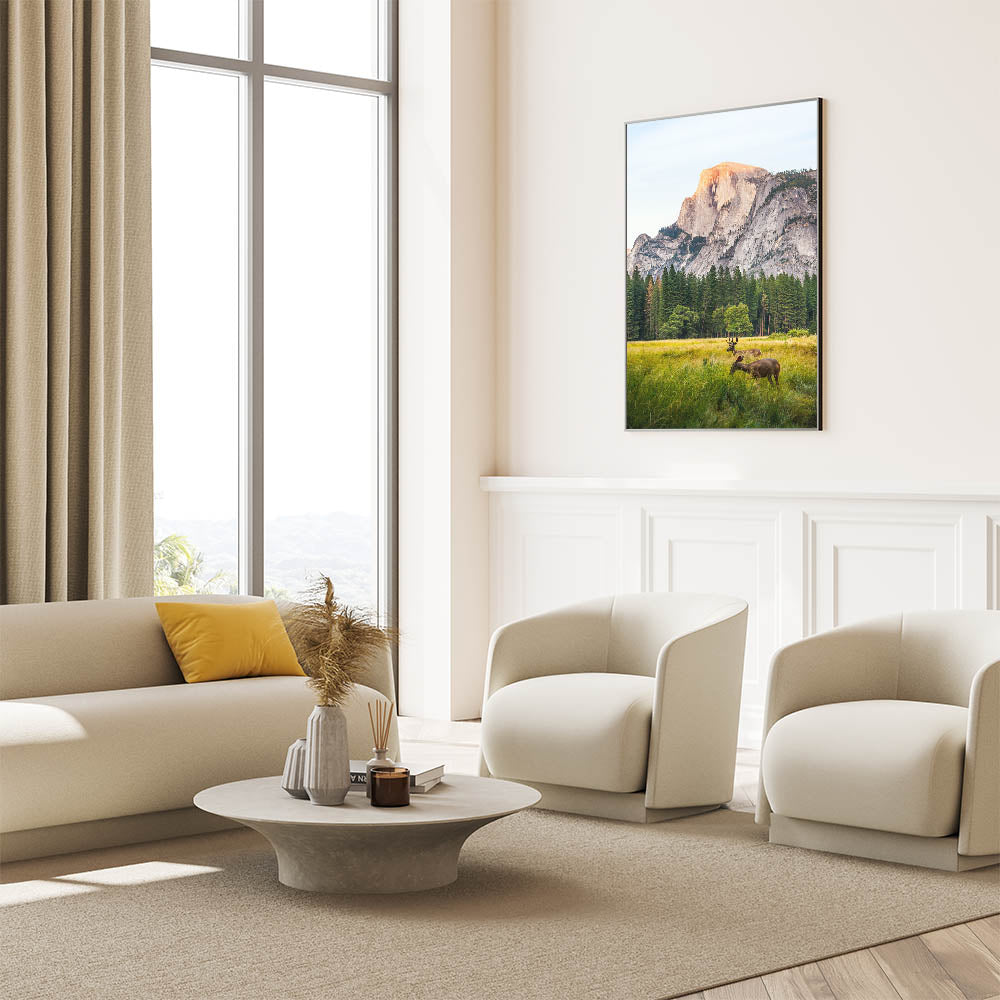 Immerse yourself in the breathtaking beauty of nature with this mountain meadow spring wall art, featuring towering granite cliffs, lush green forests, and a serene meadow with grazing deer. The warm glow of the sunlight enhances the natural textures and colors, creating a spring landscape wall art piece that evokes peace, freedom, and the splendor of the great outdoors.