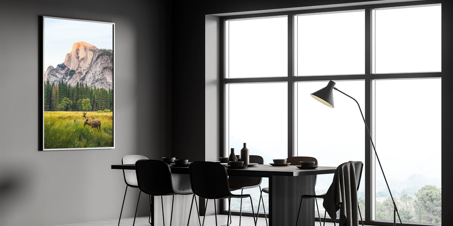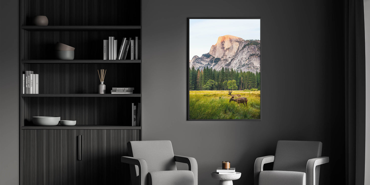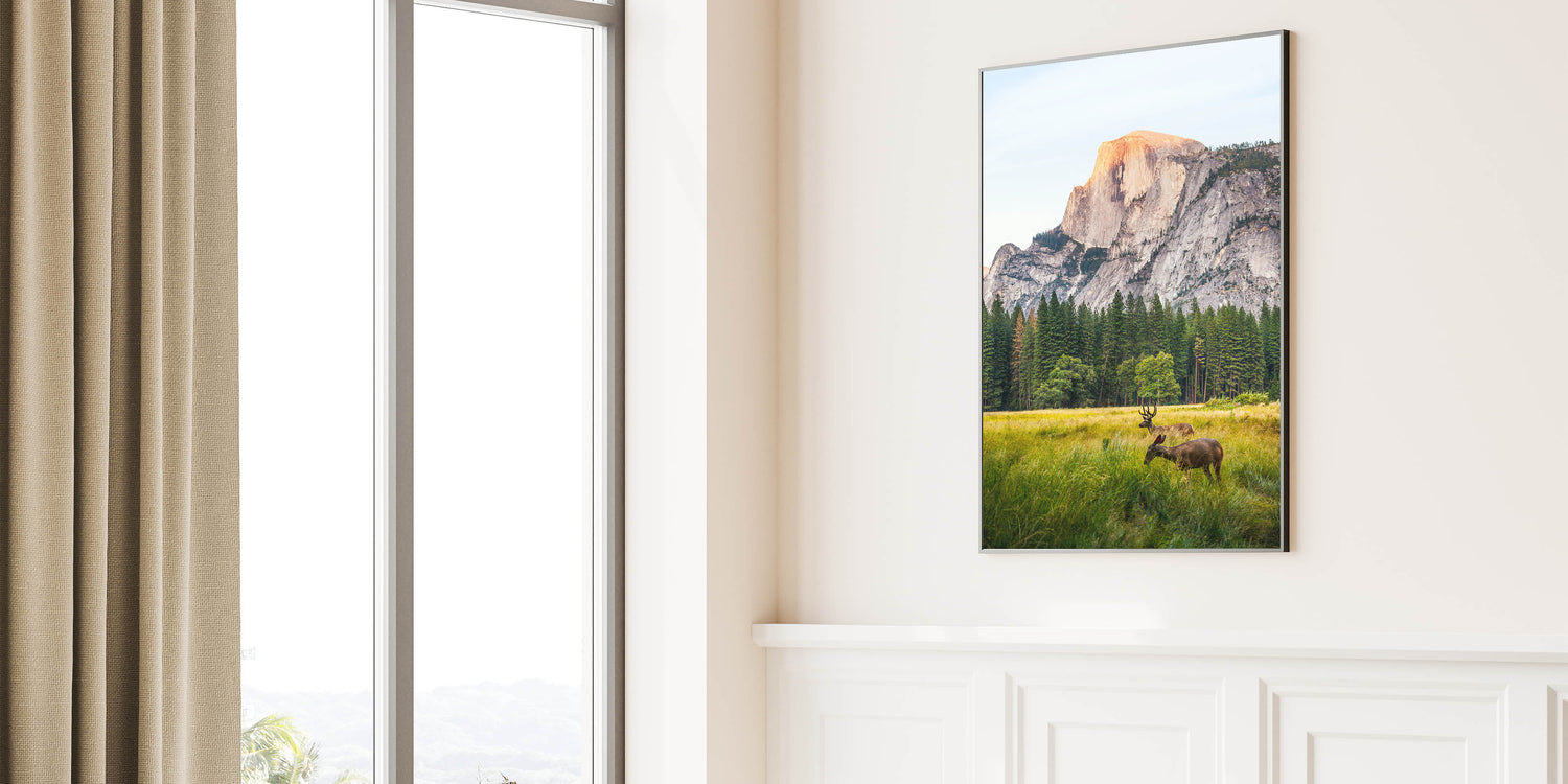 Immerse yourself in the breathtaking beauty of nature with this mountain meadow spring wall art, featuring towering granite cliffs, lush green forests, and a serene meadow with grazing deer. The warm glow of the sunlight enhances the natural textures and colors, creating a spring landscape wall art piece that evokes peace, freedom, and the splendor of the great outdoors.
