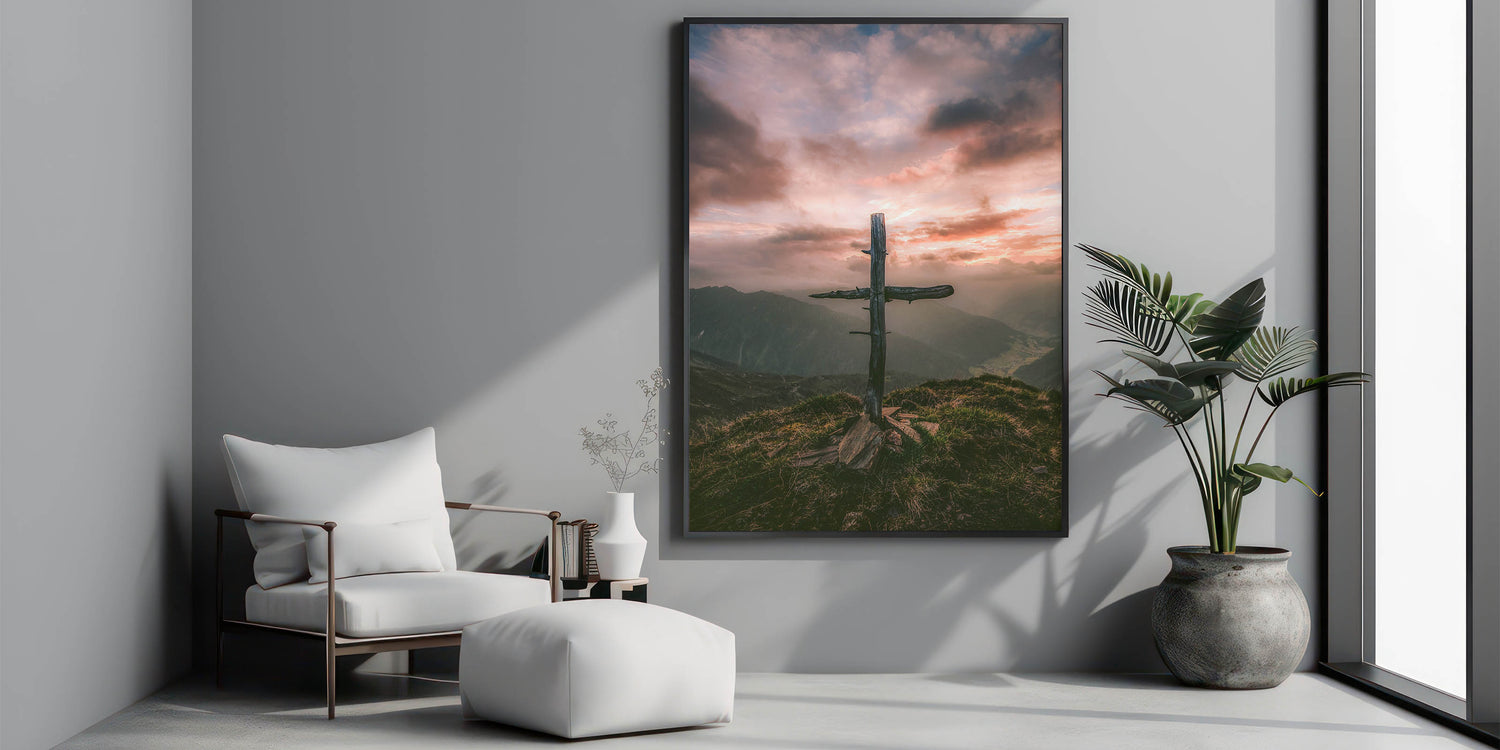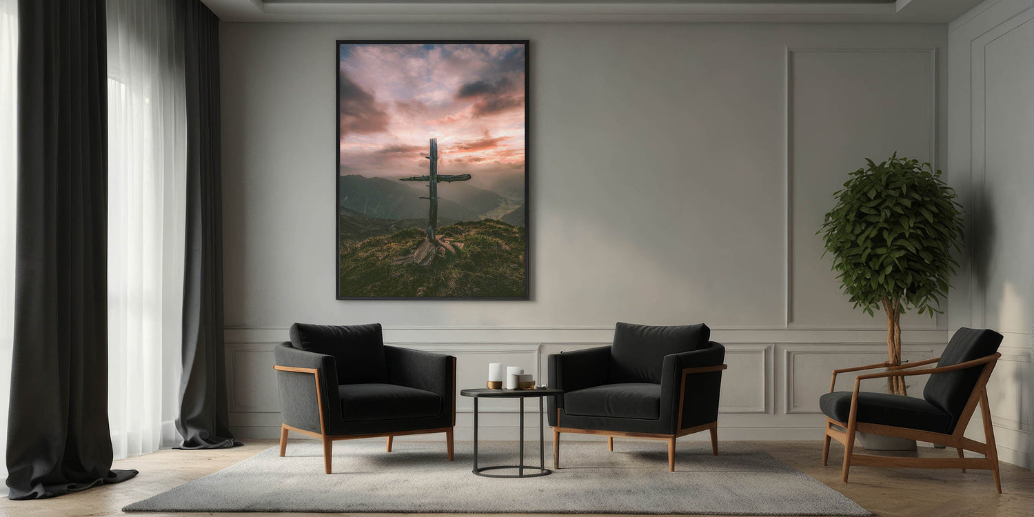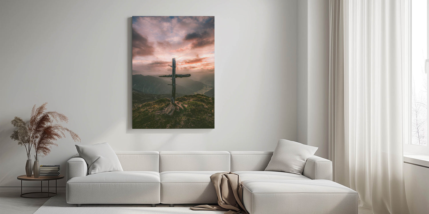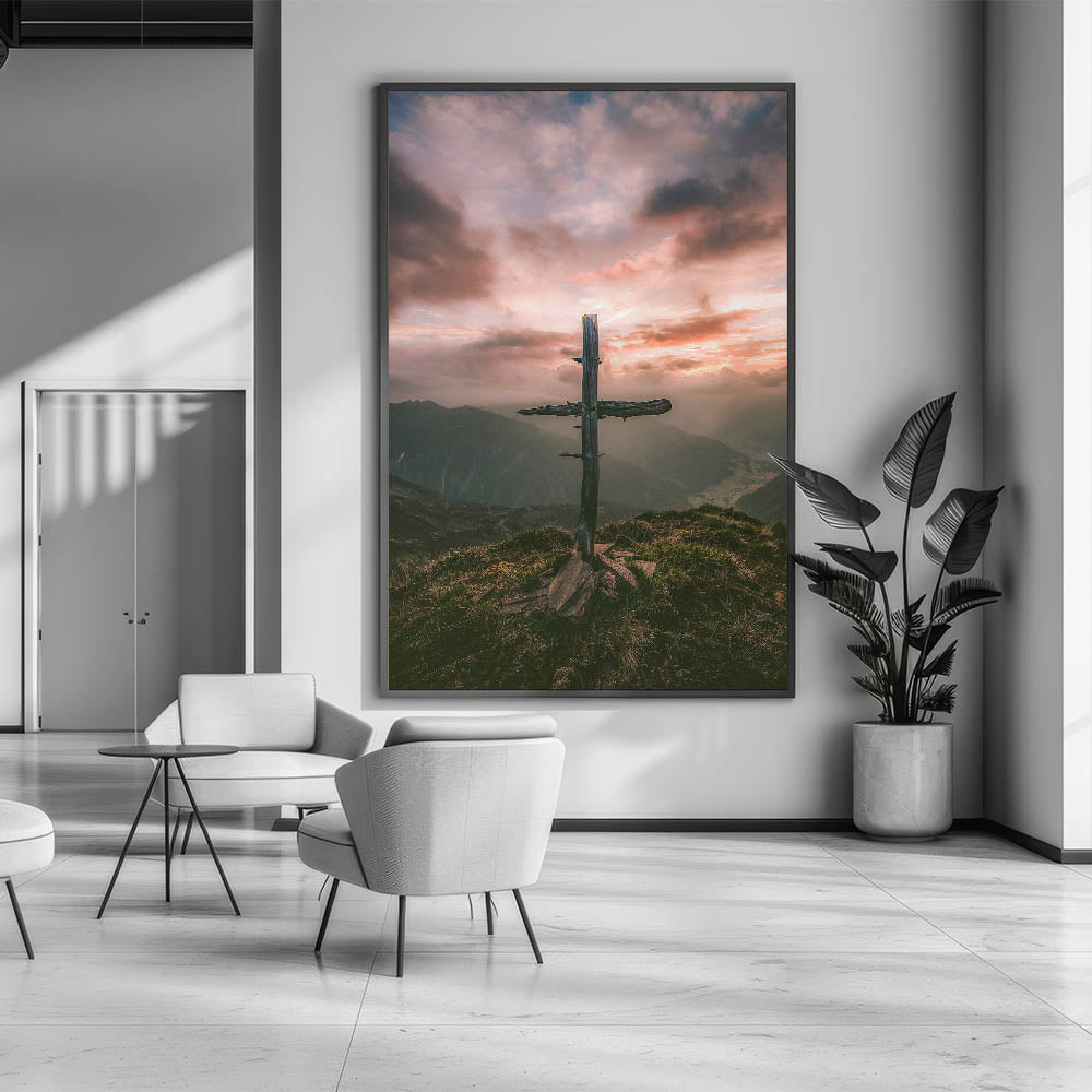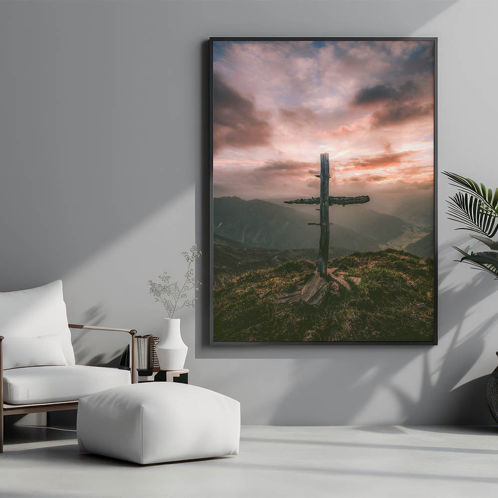 Experience the breathtaking beauty of nature and spirituality with this Spring Landscape Wall Art, featuring a rustic wooden cross standing tall against a dramatic sunset sky. The warm tones of orange and pink blend seamlessly with the dark, moody landscape, creating a powerful and serene composition.