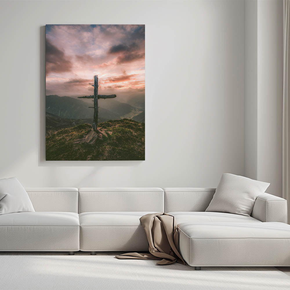 Spring Landscape Wall Art – Rustic Cross at Sunset Canvas Print