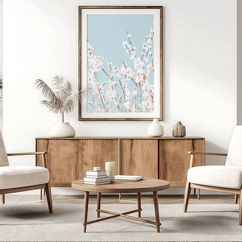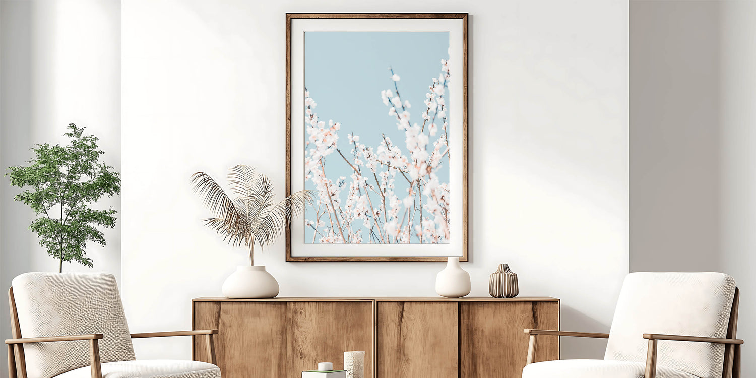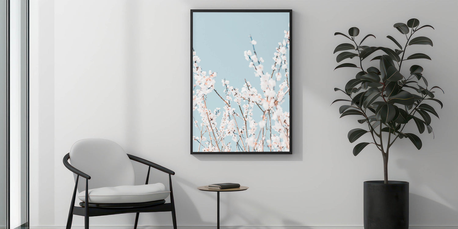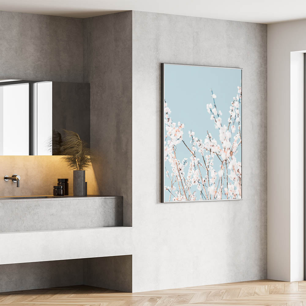Breathe in the fresh beauty of spring with this elegant spring wall art, featuring delicate white blossoms set against a tranquil pastel blue sky. The soft hues and intricate floral details create a calming and sophisticated composition, perfect for bringing a touch of botanical wall art into your home. This spring canvas art captures the essence of renewal and elegance, making it a stunning focal point for any space.
