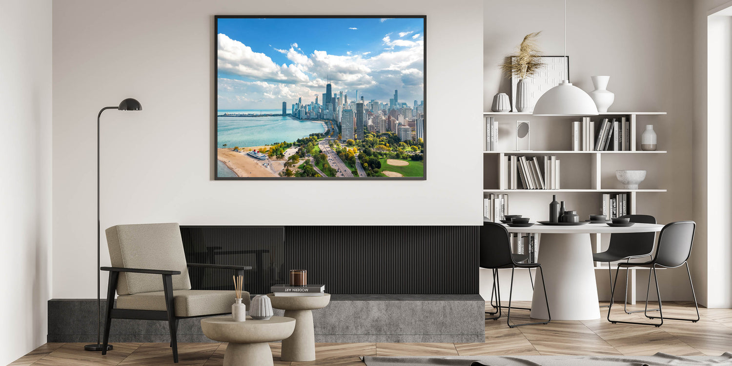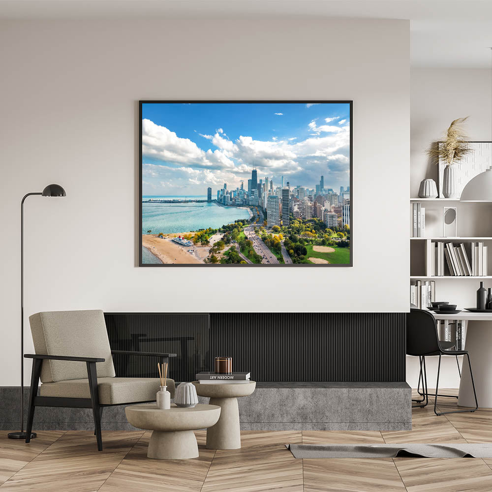 Capture the serene beauty of Chicago with this stunning wall art showcasing the city’s iconic skyline alongside the beach and lush park. The calming blues of Lake Michigan, the expansive greenery of the park, and the crisp skyline come together in perfect harmony, offering a peaceful yet vibrant view of the city. This artwork is ideal for adding a tranquil yet dynamic touch to your home or office decor.