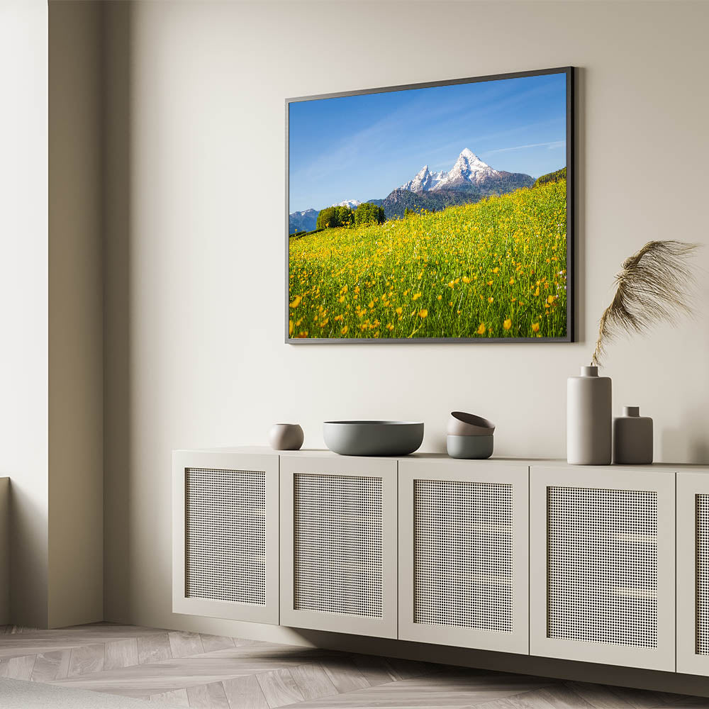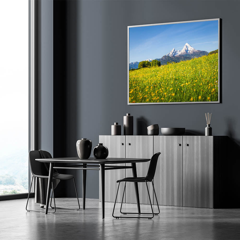 Immerse yourself in the beauty of the Bavarian Alps with this breathtaking meadow landscape artwork. Featuring a lush field of vibrant yellow flowers set against the dramatic snow-capped peaks of the Alps, this artwork captures the stunning natural beauty of Bavaria. Ideal for those who love outdoor adventures or dream of traveling through Germany’s iconic countryside, this piece adds a bright and serene atmosphere to any space.
