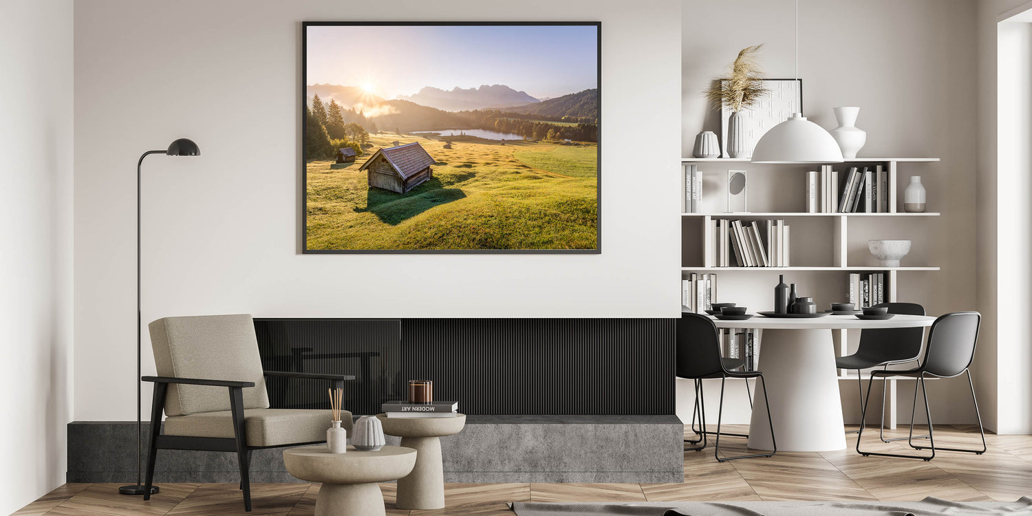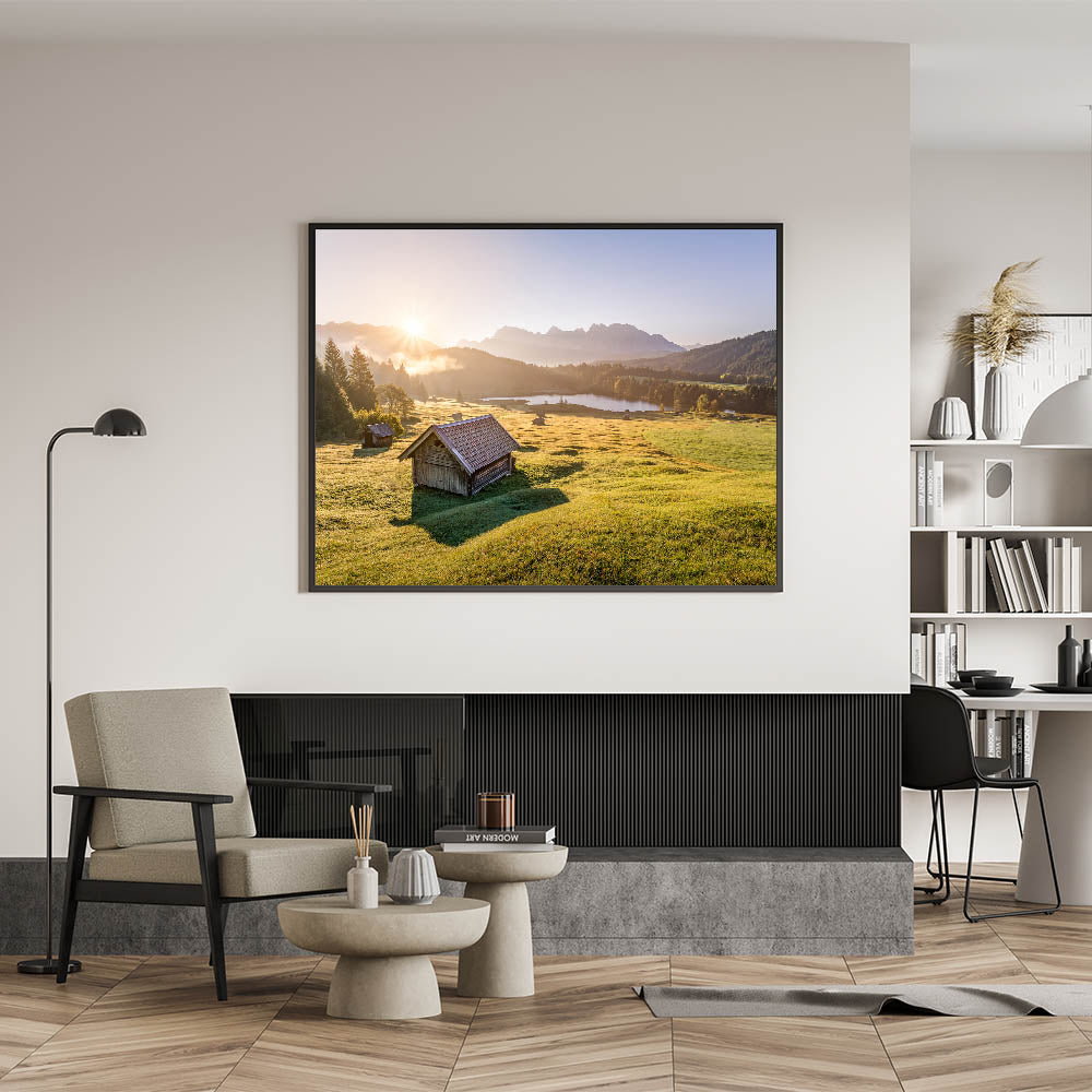 Transform your space with the peaceful ambiance of this sunrise over the Bavarian Alps, available in various formats to suit any decor style.