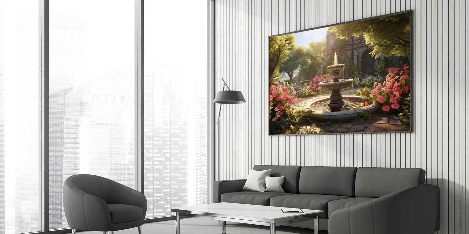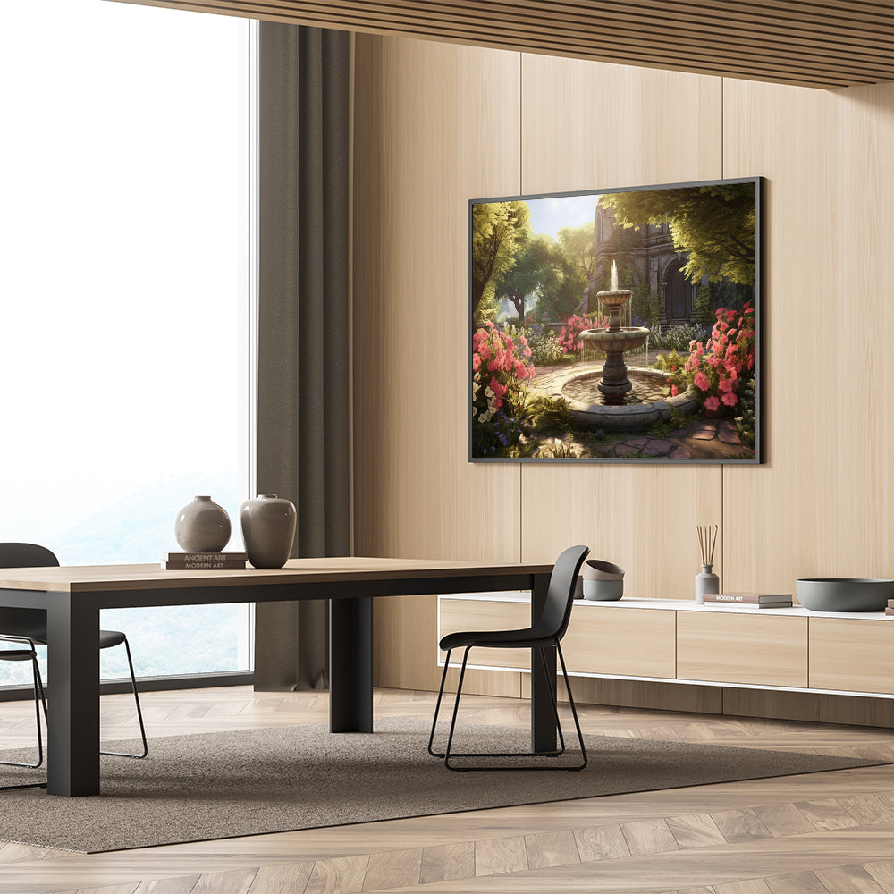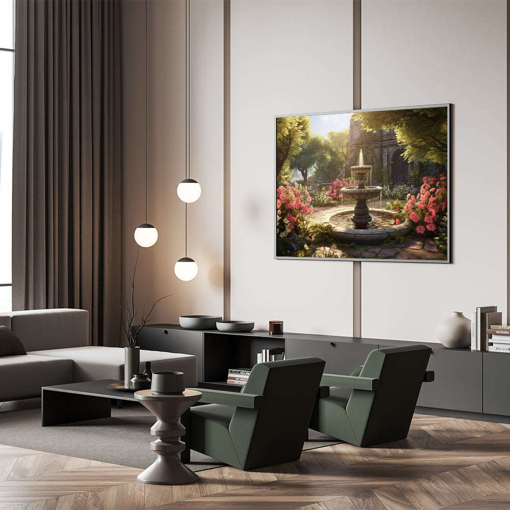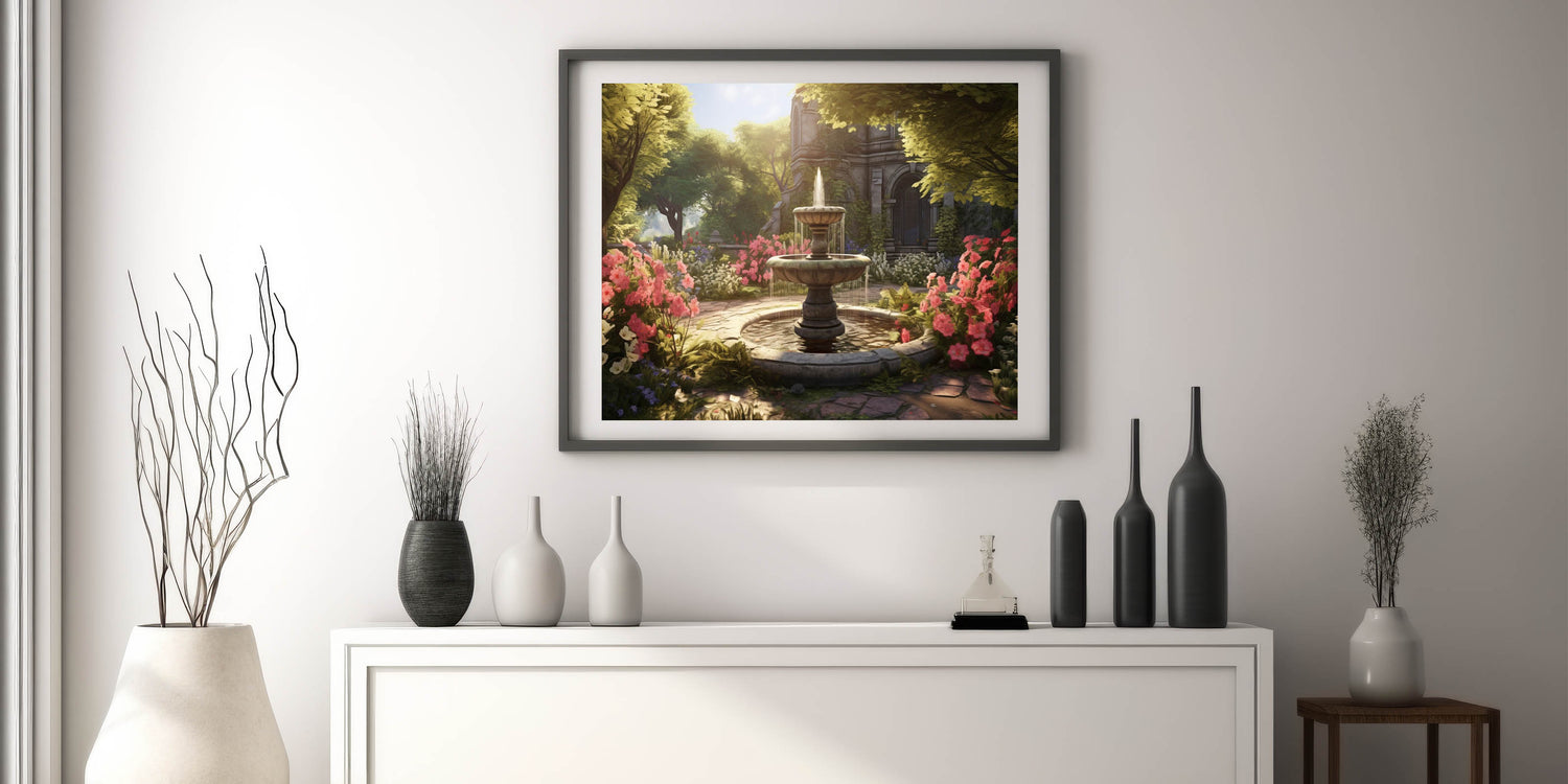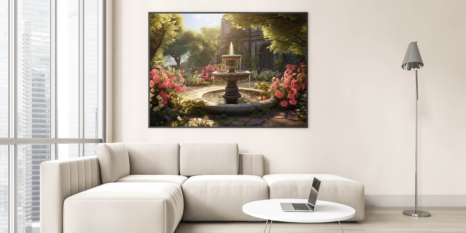 This piece is perfect for nature lovers and anyone looking to bring a bit of the outdoors inside. The vibrant floral elements combined with the classic fountain design make this artwork a versatile addition to both traditional and contemporary decor styles.