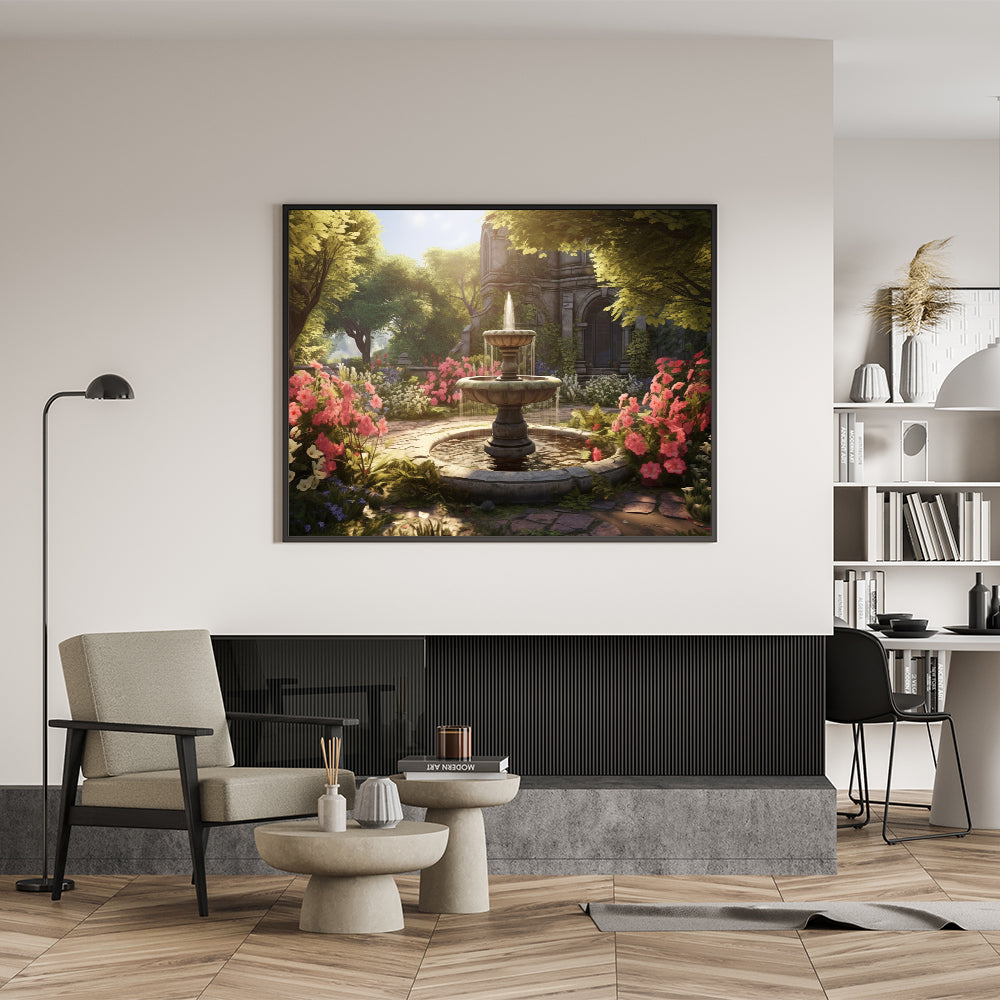 Charming Garden Fountain Wall Art - Vibrant Floral Canvas Print