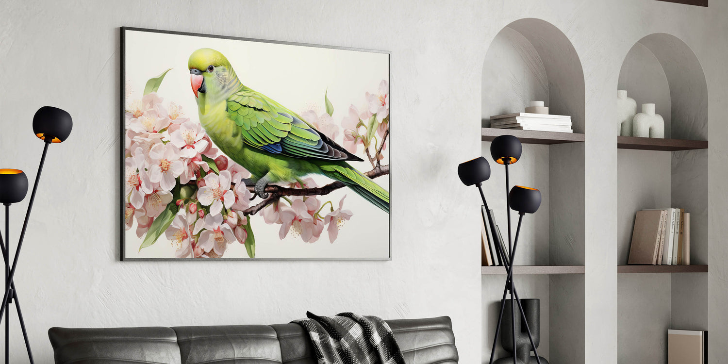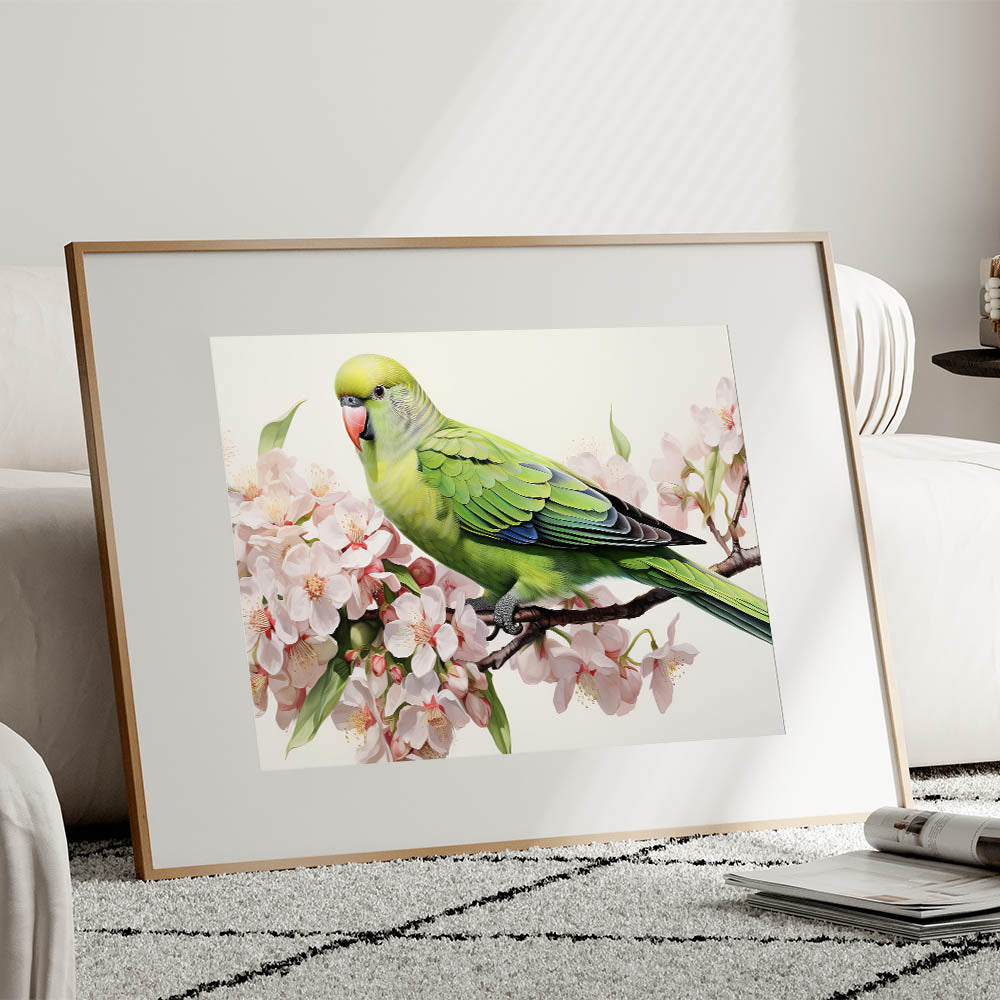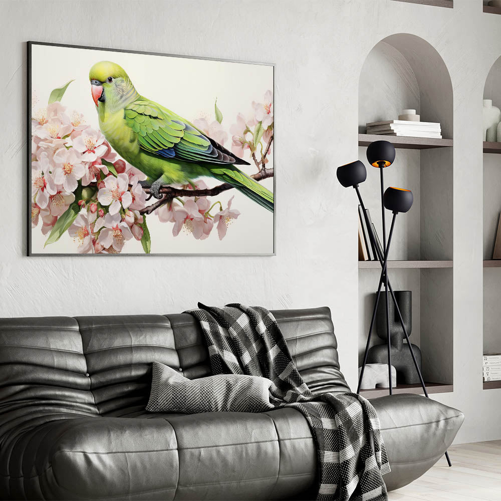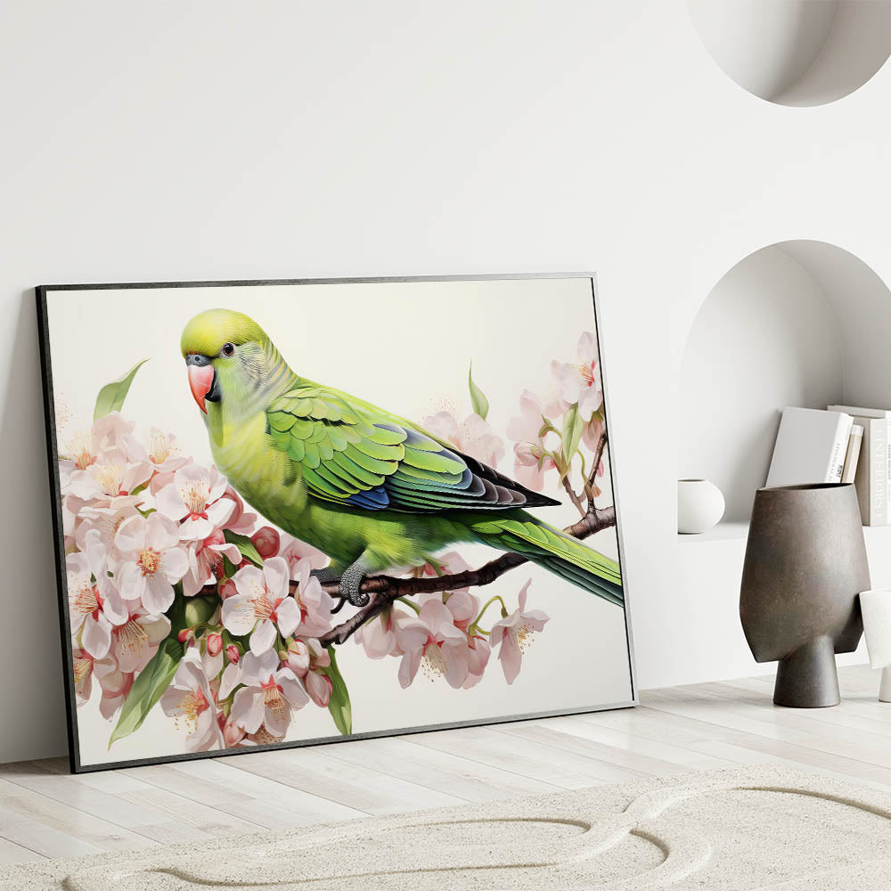 Bring the beauty of nature into your home with this stunning Cherry Blossom Parrot Wall Art. This elegant piece features a vibrant green parrot perched gracefully among soft pink cherry blossoms. The harmonious blend of the parrot's vivid feathers with the delicate flowers creates a serene and enchanting scene that is perfect for adding a touch of elegance and tranquility to any room.