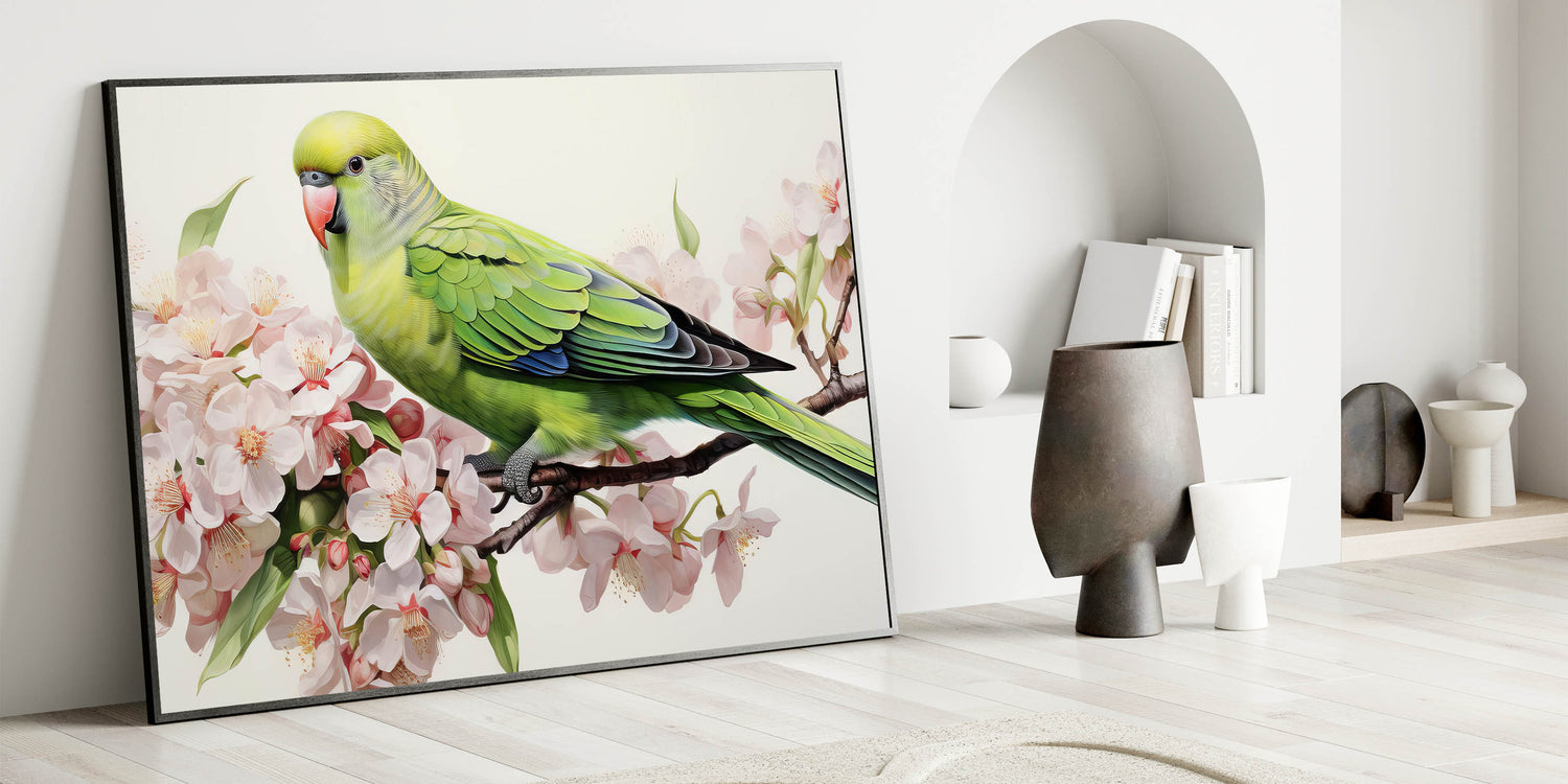 Cherry Blossom Parrot Wall Art – Elegant Floral Parrot Decor