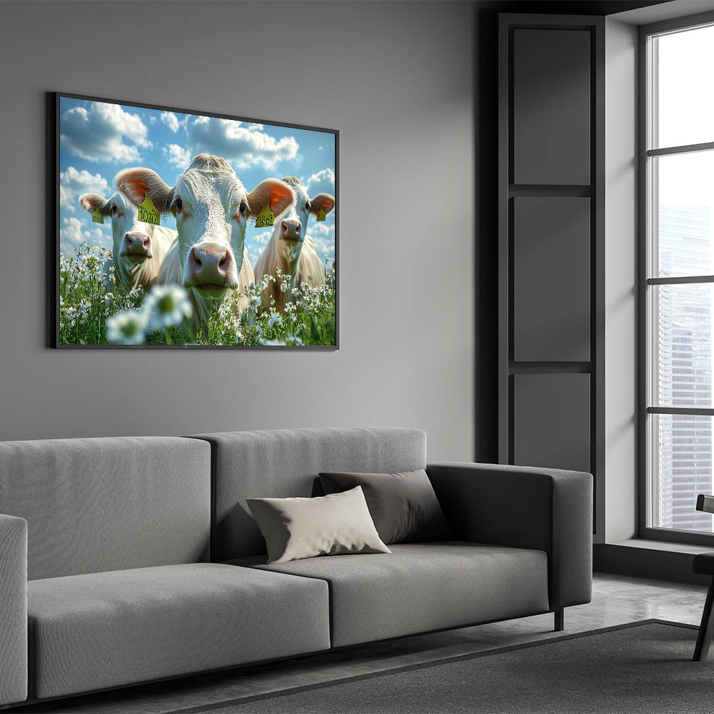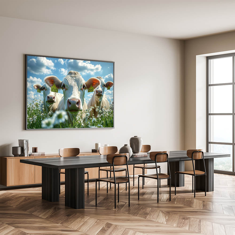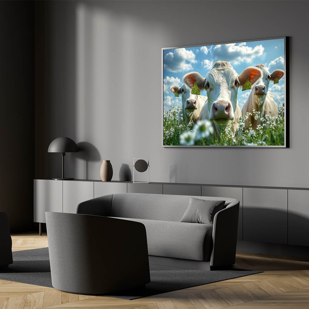 Celebrate the charm of pastoral life with this delightful countryside wall art. Featuring three curious cows surrounded by blooming white wildflowers under a bright blue sky, this artwork brings the cheerful simplicity of rural life into your home. Perfect for farmhouse decor or rustic interiors, it’s a lively and heartwarming addition to any space.