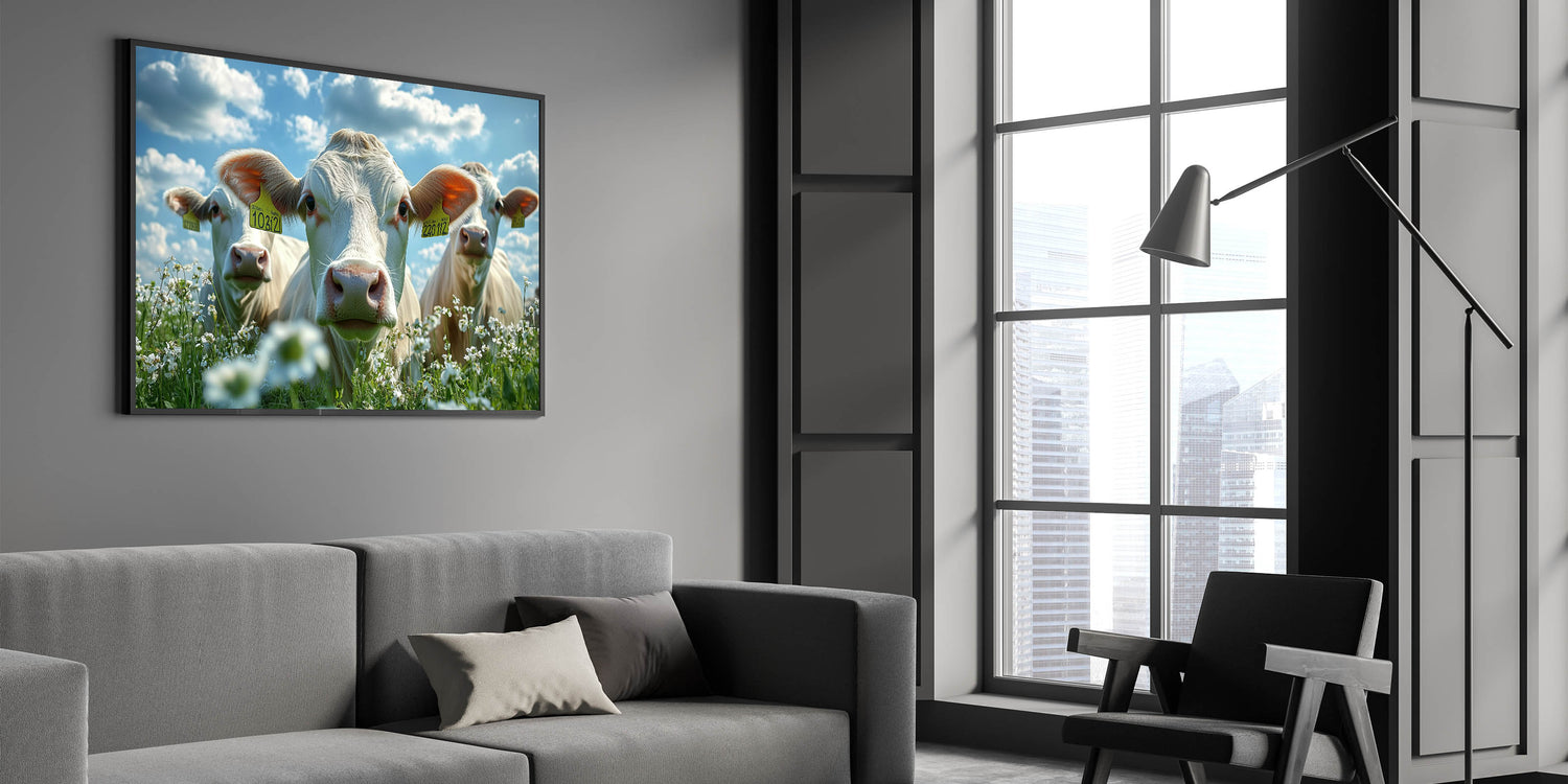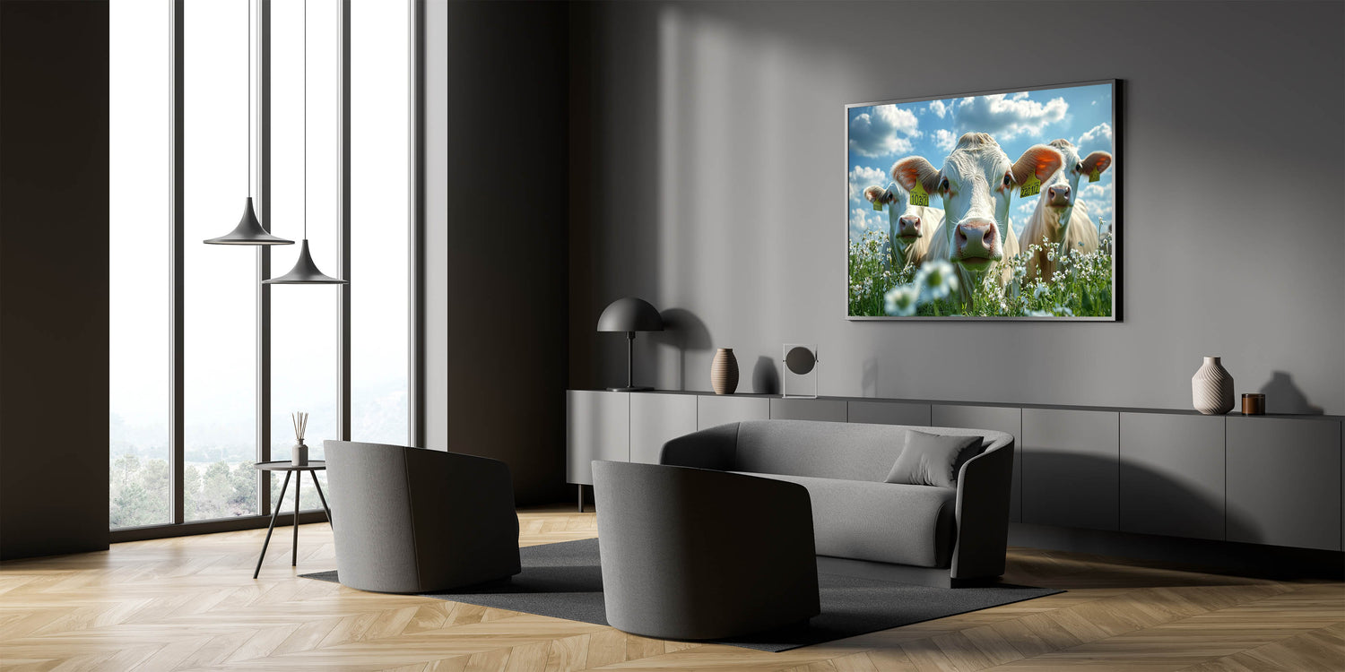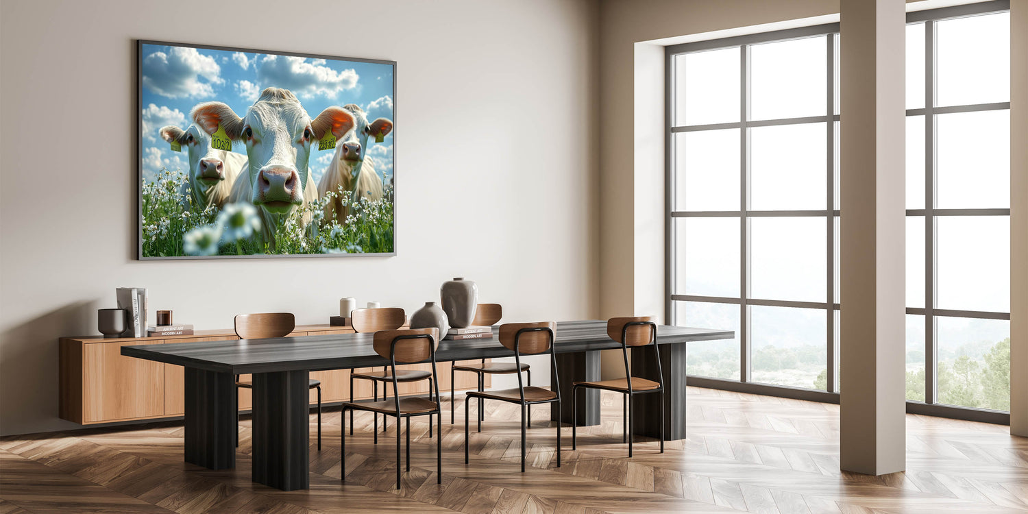 Celebrate the charm of pastoral life with this delightful countryside wall art. Featuring three curious cows surrounded by blooming white wildflowers under a bright blue sky, this artwork brings the cheerful simplicity of rural life into your home. Perfect for farmhouse decor or rustic interiors, it’s a lively and heartwarming addition to any space.