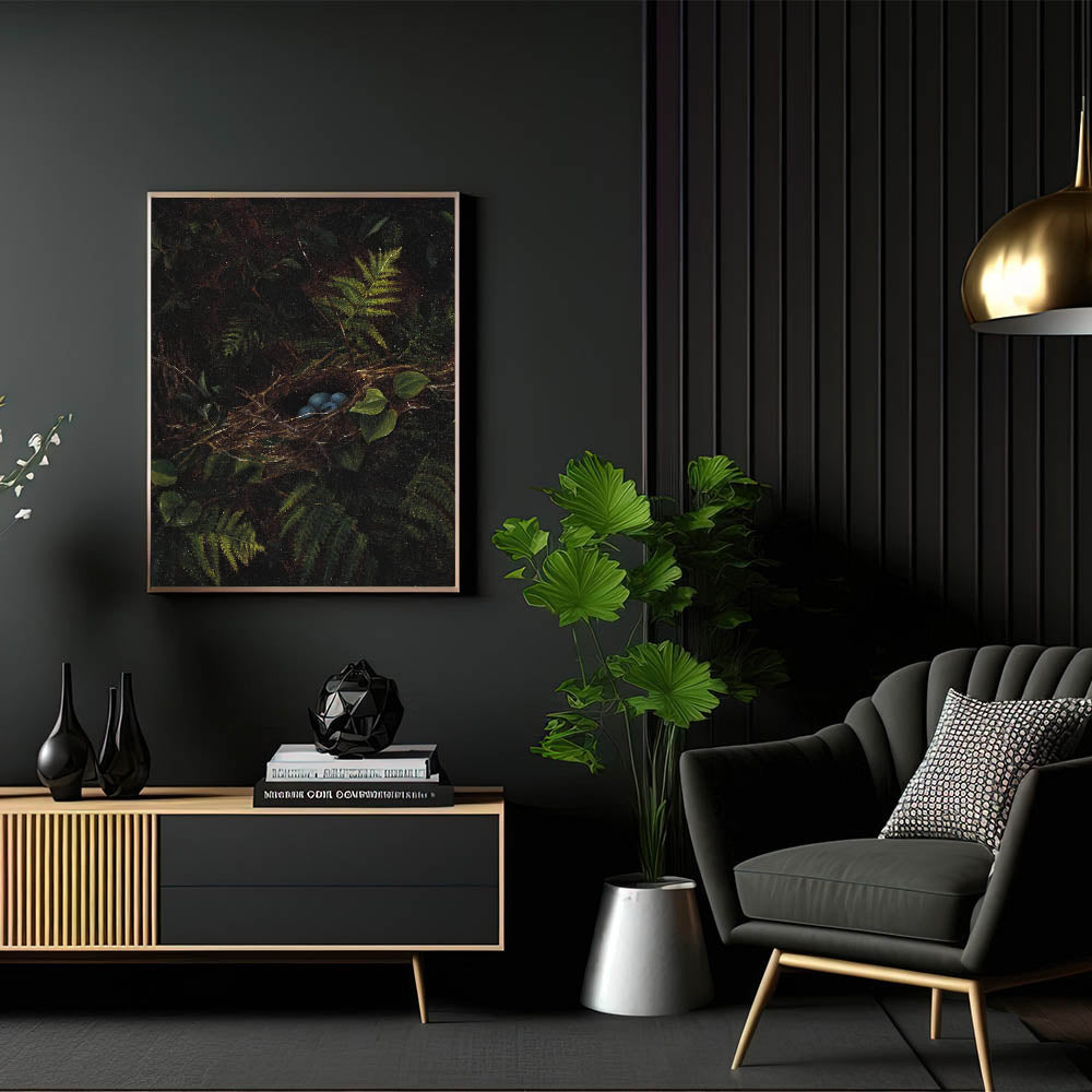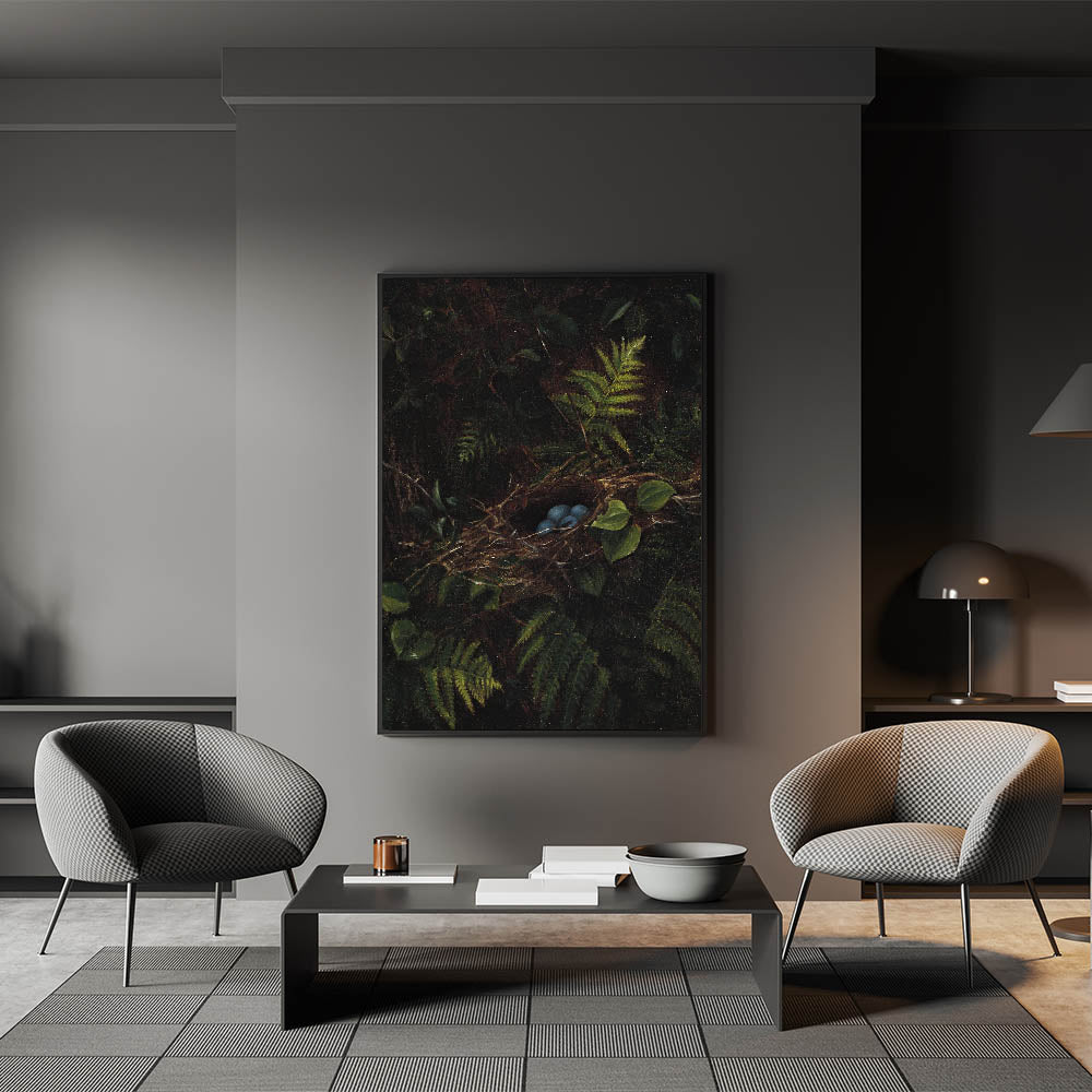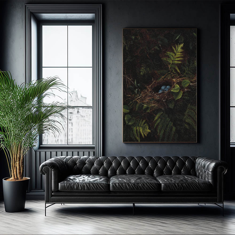 Bring the serene beauty of nature into your space with this Dark Moody wall art, featuring a detailed depiction of a bird’s nest with blue eggs nestled among lush ferns and leaves. The painting’s dark background enhances the vibrant green foliage, creating a rich contrast that draws attention to the delicate nest and its eggs. Ideal for those looking to add a touch of natural elegance to their home, this artwork is perfect for enhancing living rooms, studies, or any space that appreciates moody, nature-inspired decor.