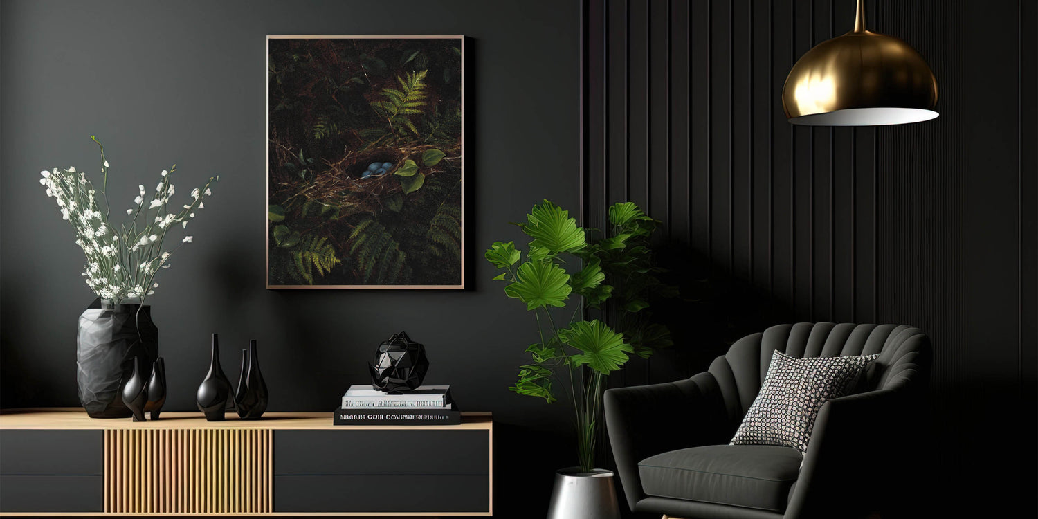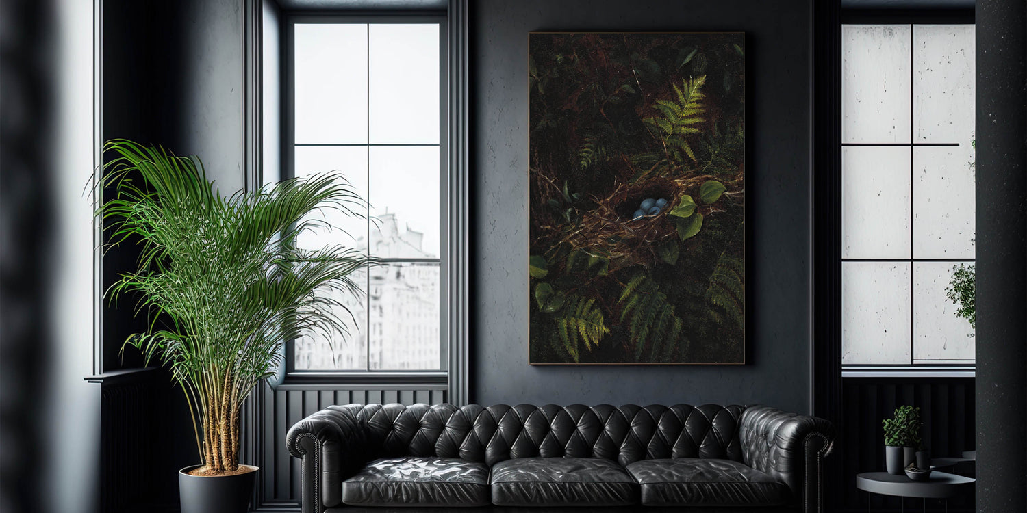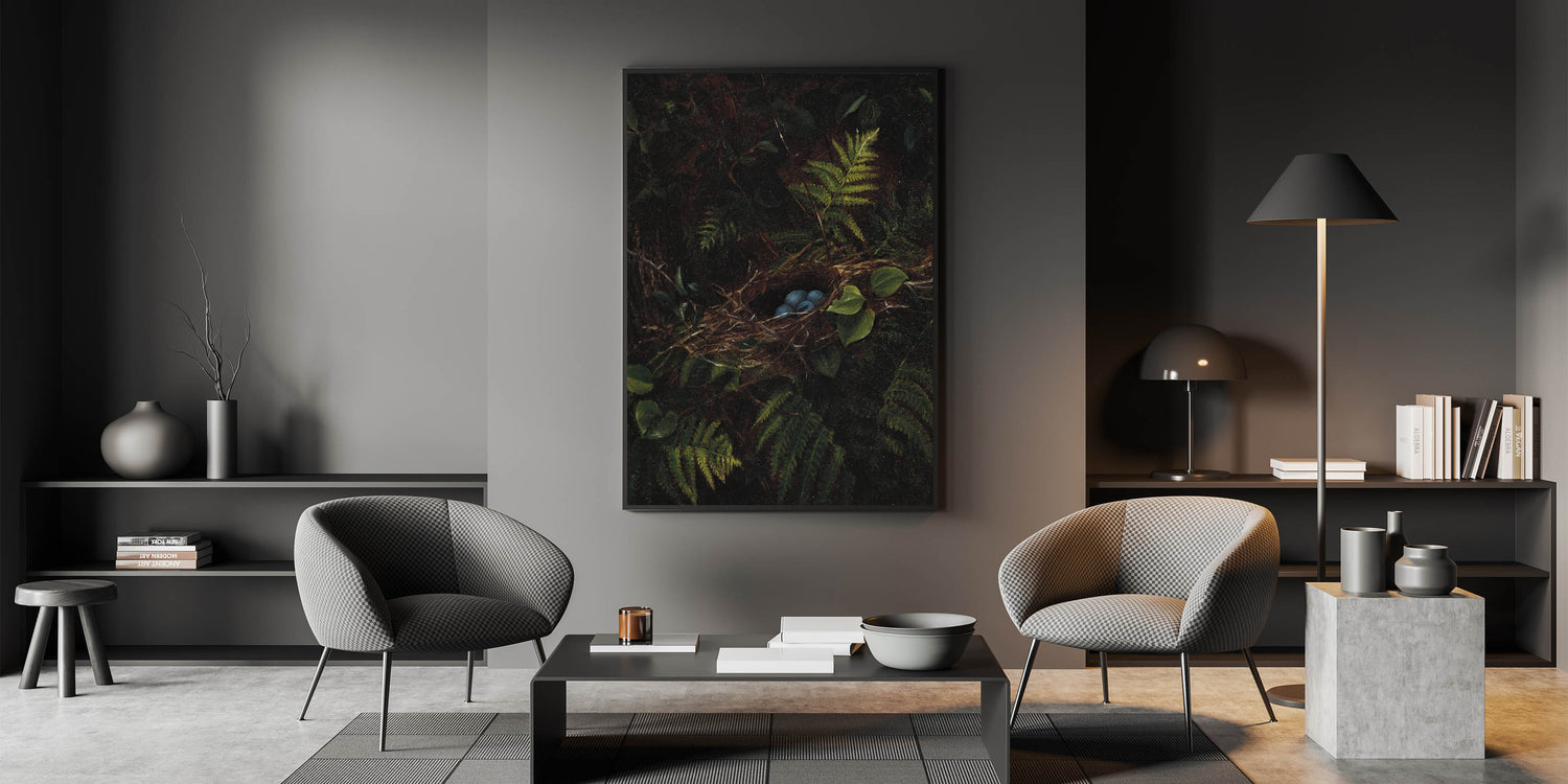 Bring the serene beauty of nature into your space with this Dark Moody wall art, featuring a detailed depiction of a bird’s nest with blue eggs nestled among lush ferns and leaves. The painting’s dark background enhances the vibrant green foliage, creating a rich contrast that draws attention to the delicate nest and its eggs. Ideal for those looking to add a touch of natural elegance to their home, this artwork is perfect for enhancing living rooms, studies, or any space that appreciates moody, nature-inspired decor.