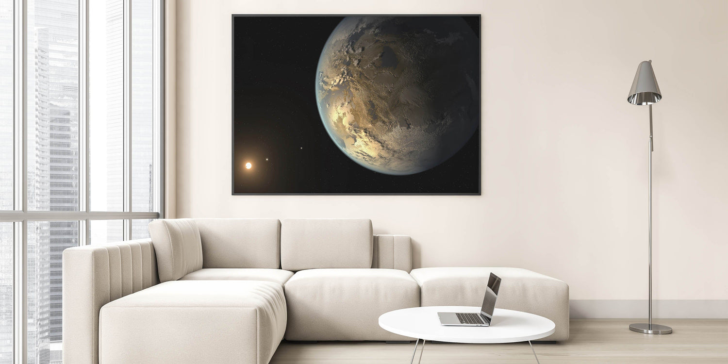 - Celestial Wall Decor featuring an Earth-like exoplanet illuminated by the soft glow of a distant star.