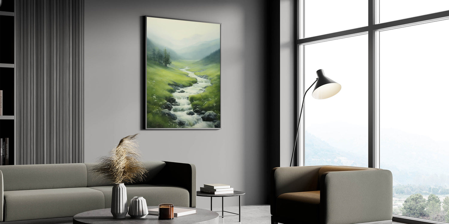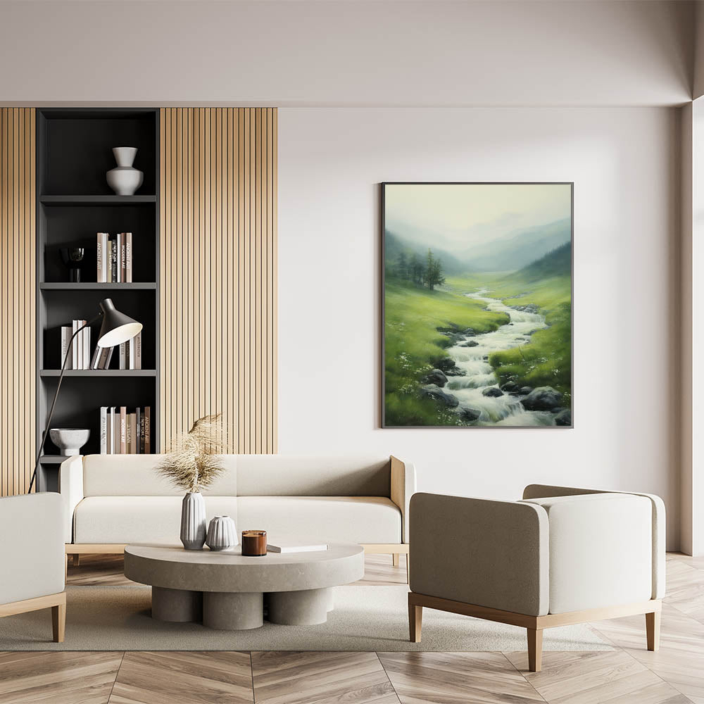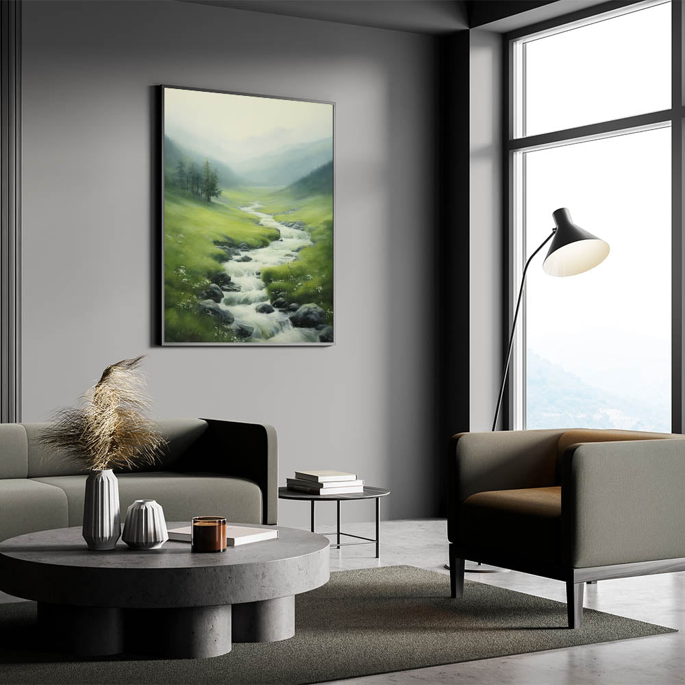 Immerse yourself in nature with this Electric Landscape Wall Art, featuring a serene mountain stream flowing through lush, green meadows. This vibrant and calming piece captures the essence of a misty morning in nature, blending shades of green, white, and blue to create a tranquil atmosphere. Perfect for bringing the outdoors inside, this artwork is ideal for modern interiors seeking a touch of vibrant electric decor inspired by nature.