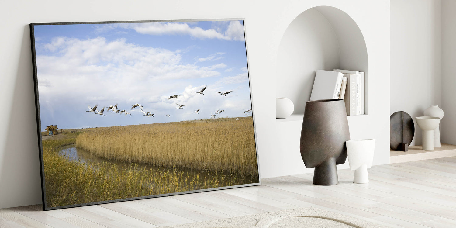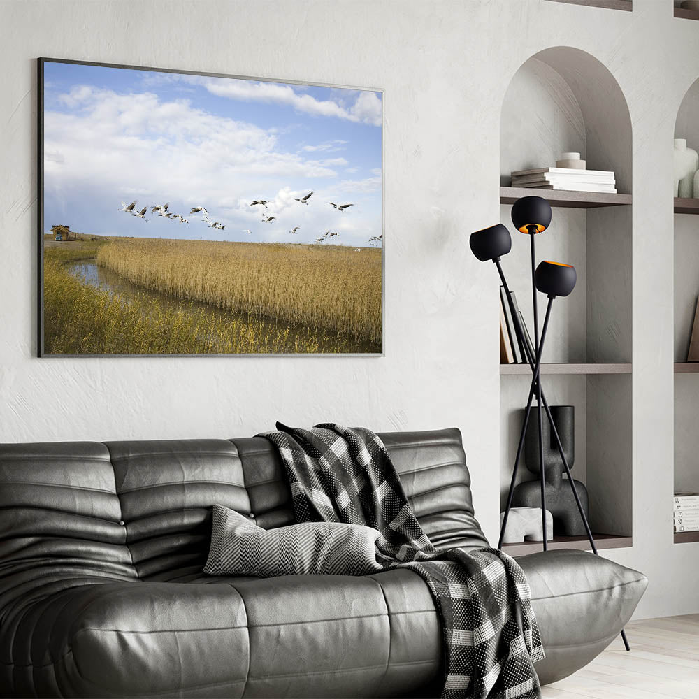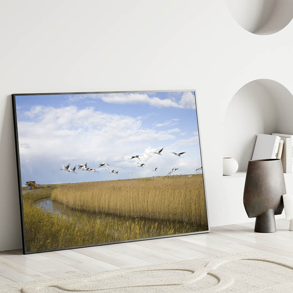 Capture the serene beauty of nature with this stunning crane wall art. Featuring a flock of cranes in majestic flight over tranquil wetlands, this artwork brings a touch of elegance and grace to any space. The soft hues of the landscape, combined with the striking imagery of the cranes, make this piece perfect for nature lovers and those looking to add a peaceful ambiance to their home.