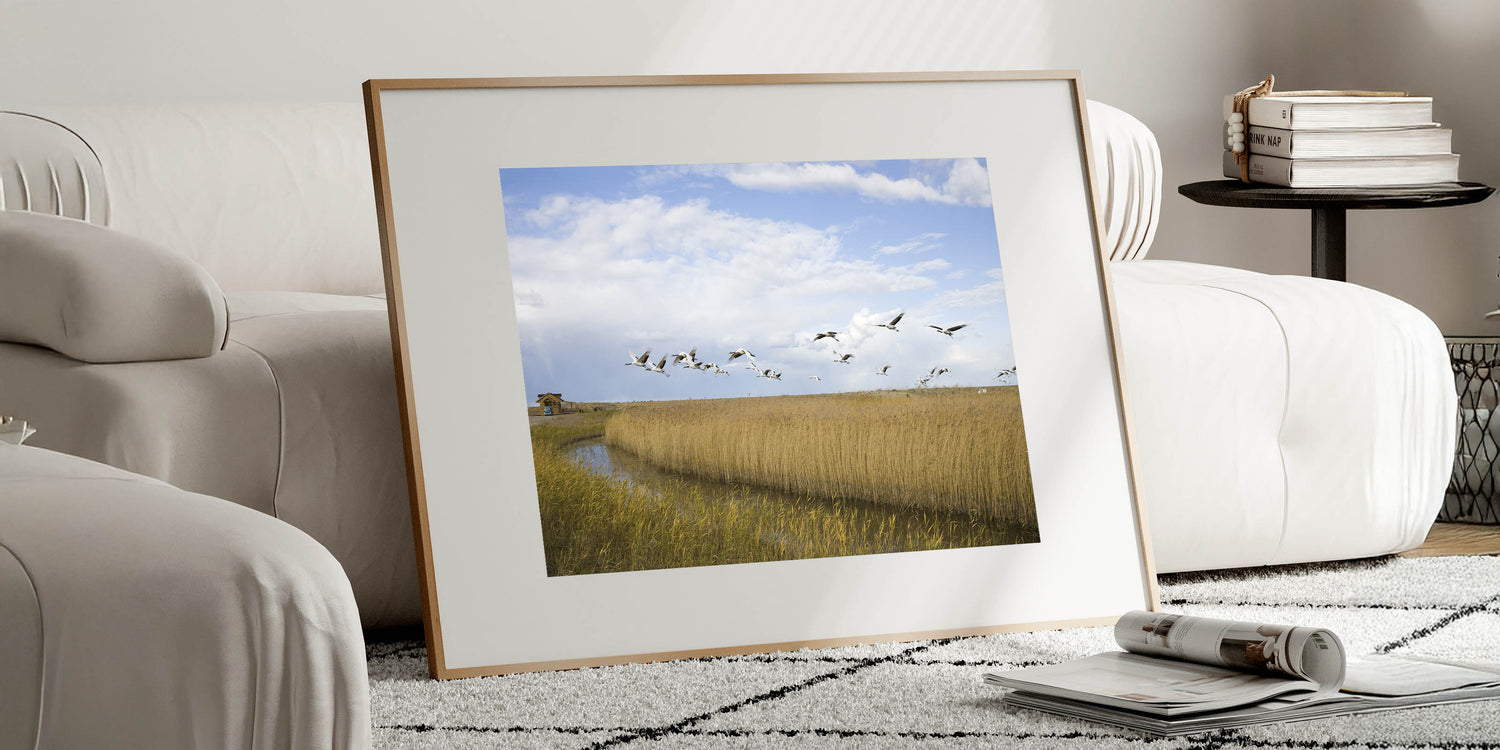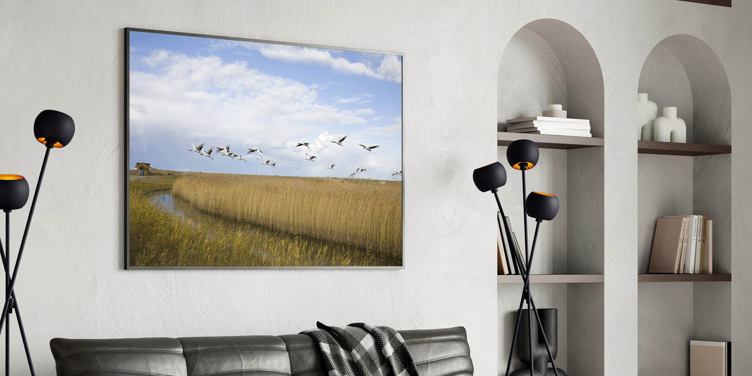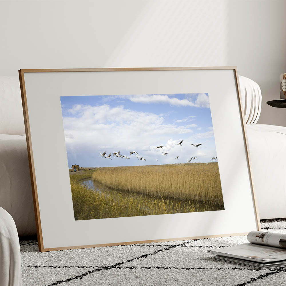 Capture the serene beauty of nature with this stunning crane wall art. Featuring a flock of cranes in majestic flight over tranquil wetlands, this artwork brings a touch of elegance and grace to any space. The soft hues of the landscape, combined with the striking imagery of the cranes, make this piece perfect for nature lovers and those looking to add a peaceful ambiance to their home.