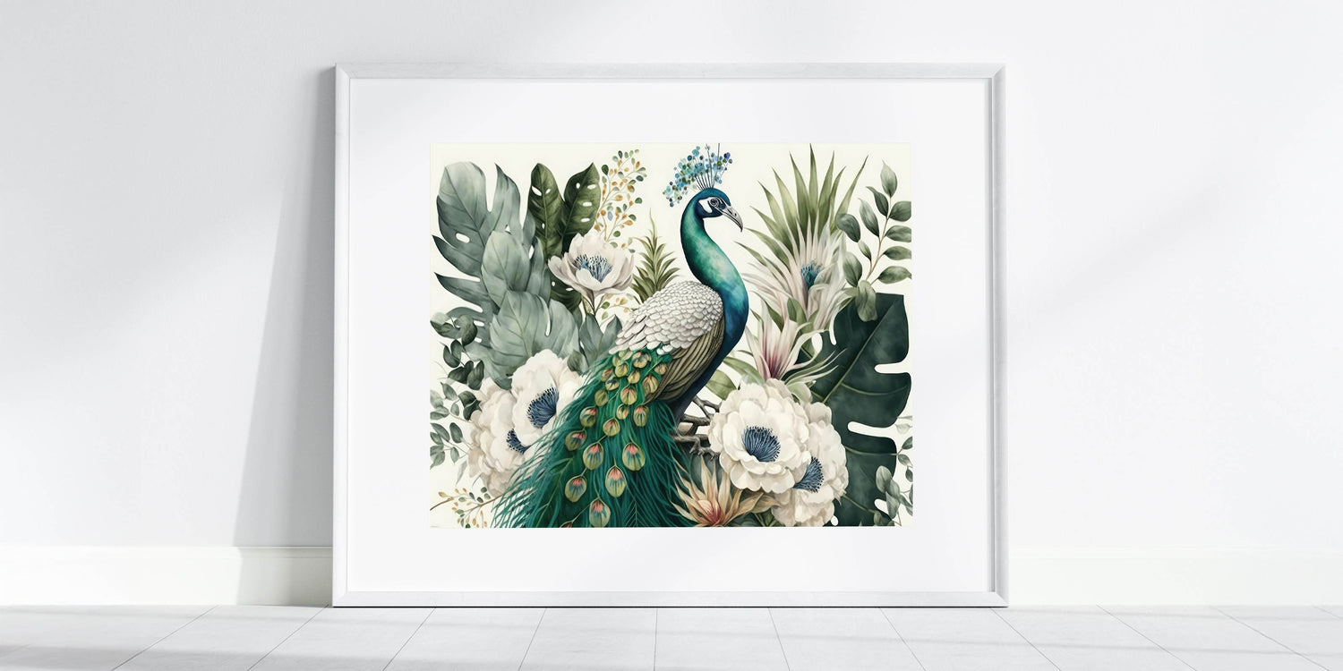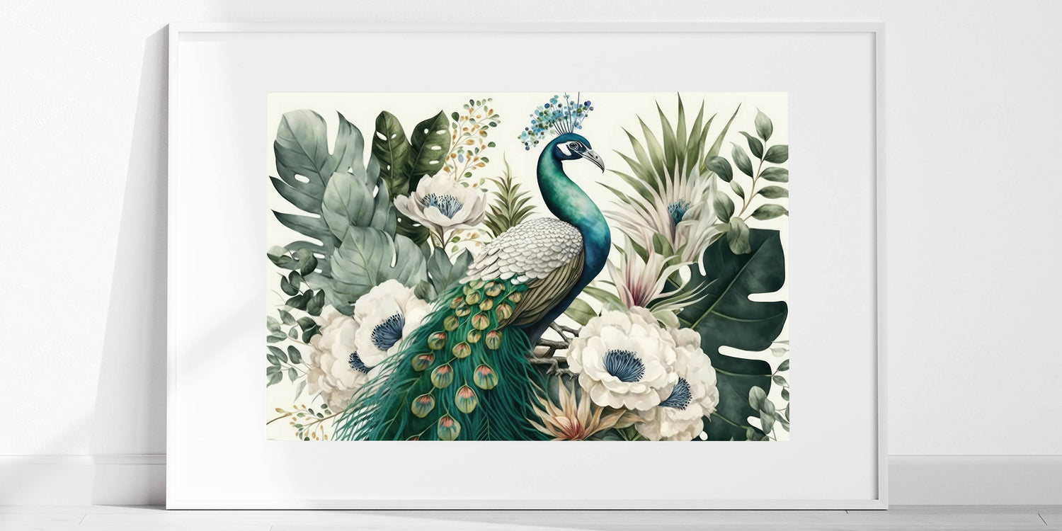 Bring a touch of natural elegance to your home with this Elegant Peacock and Botanicals Wall Art. This beautifully crafted piece features a majestic peacock nestled among lush green foliage and delicate white flowers, creating a serene and calming atmosphere. The artwork’s soft color palette of greens, whites, and blues adds a subtle sophistication to any space, making it perfect for those who appreciate the beauty of nature. Available in various formats, including stretched canvas, framed canvas, acrylic glass, and rolled prints, this piece offers versatile options to complement both modern and traditional decor styles.