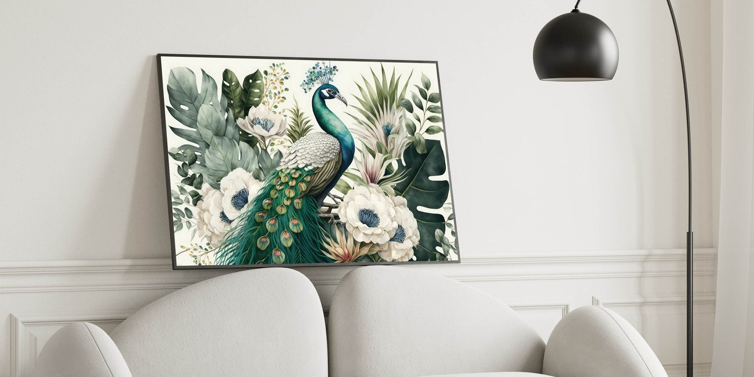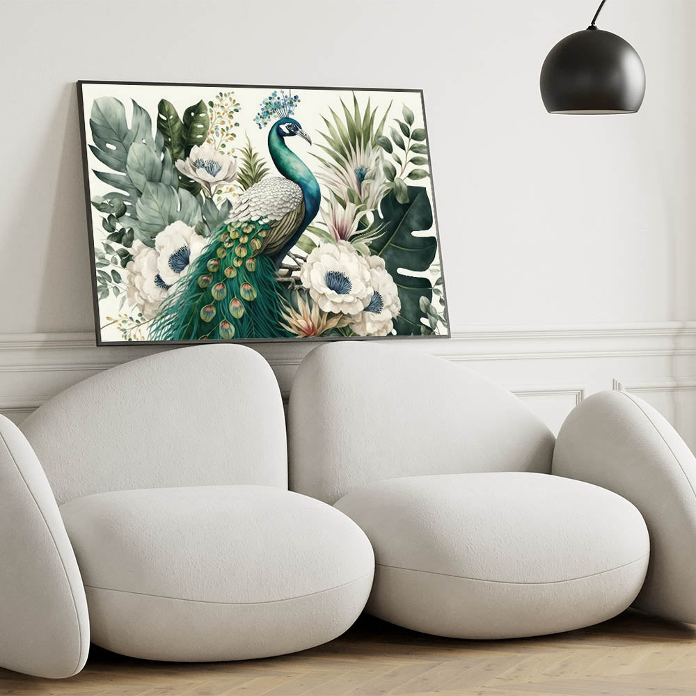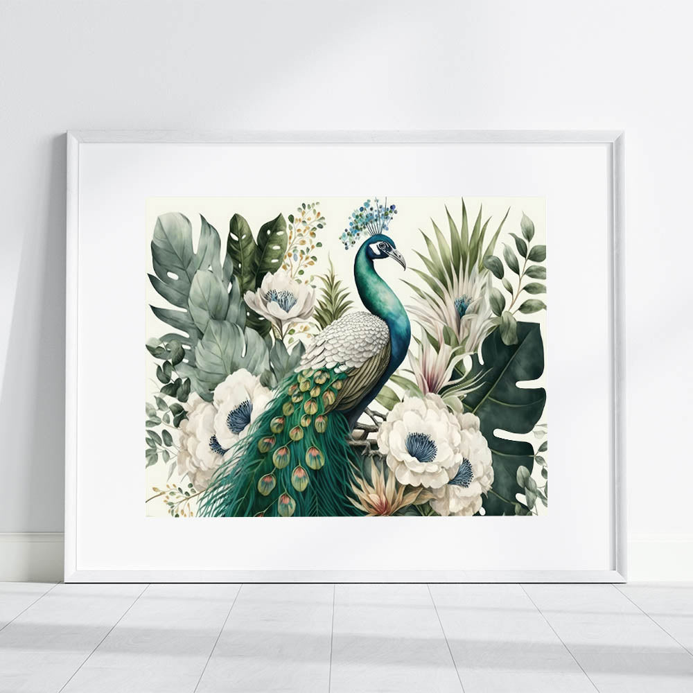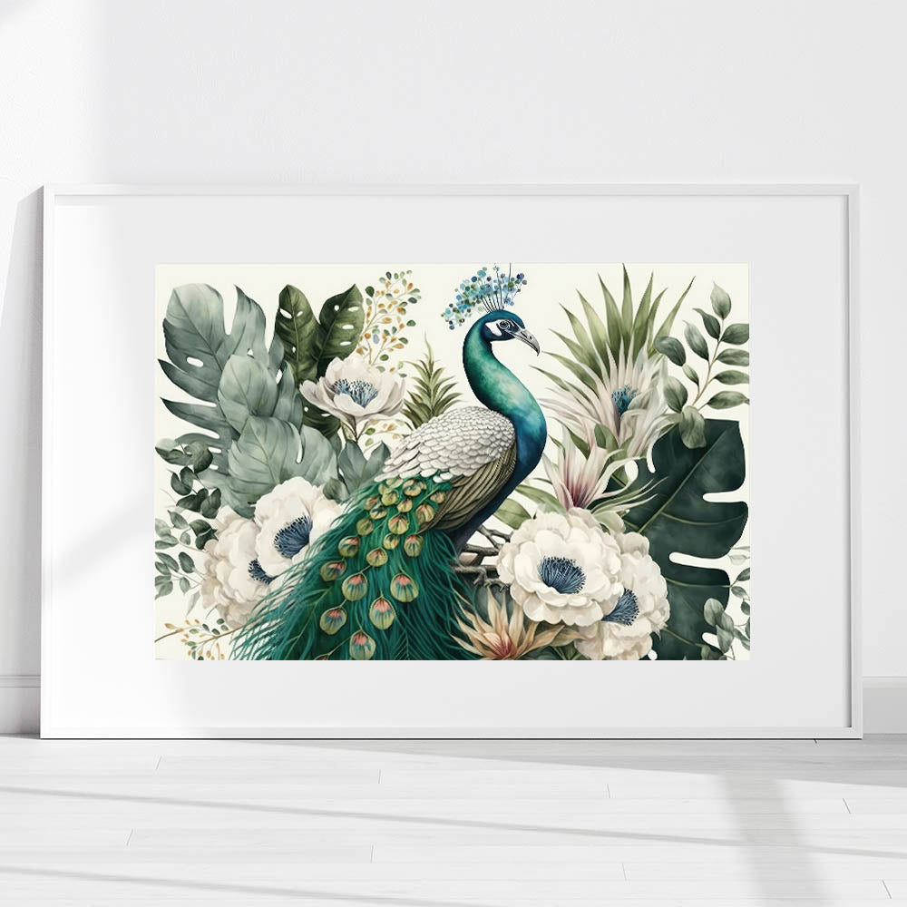 - Serene and Elegant Design: Features a peacock surrounded by lush botanicals and soft florals, creating a tranquil and sophisticated scene.